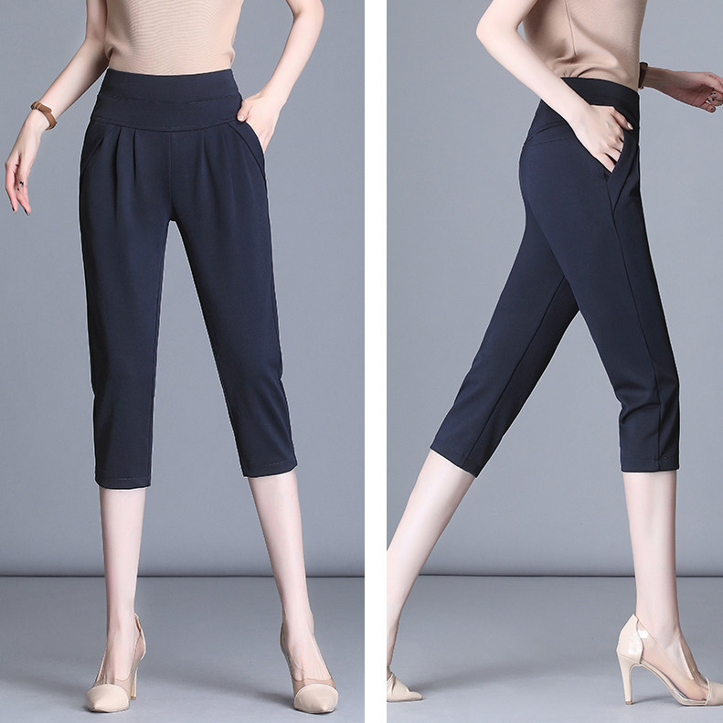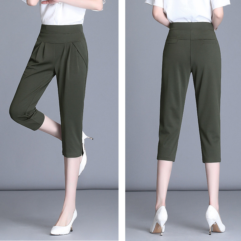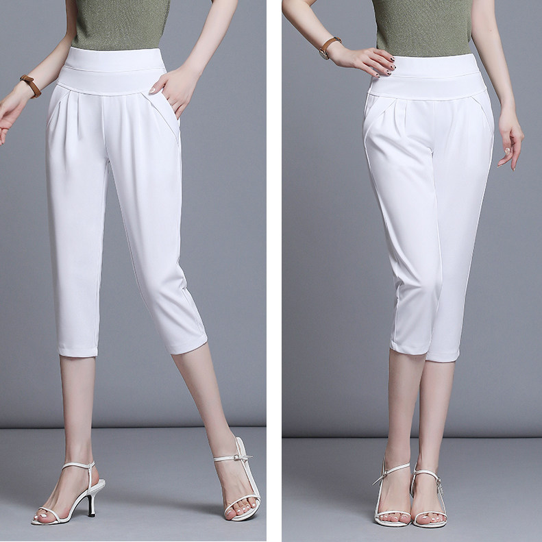 小脚中裤 白色不透高腰七分哈伦裤 弹力宽松黑色休闲裤 大码 女夏薄款