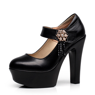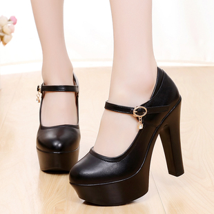 真皮13CM超高跟走秀演出鞋 圆头浅口粗跟厚防水台T台旗袍秀模特鞋