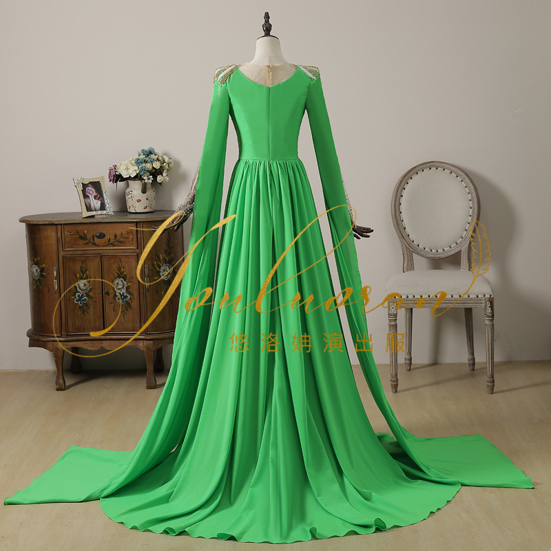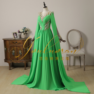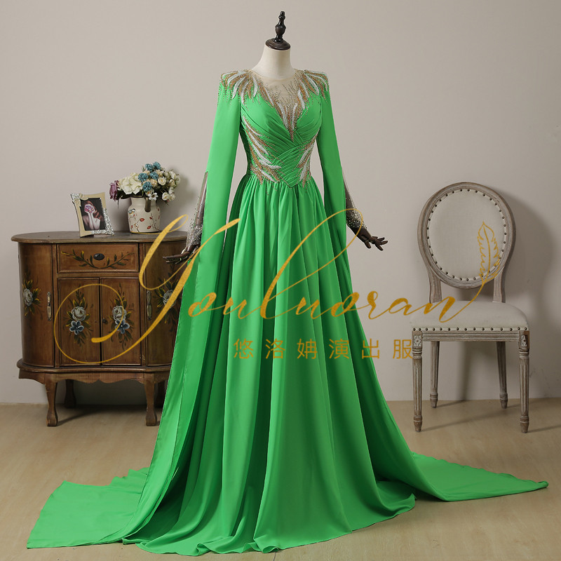 新品 重工演出服主持人礼服女独唱演奏礼服长裙 悠洛实拍绿色水袖