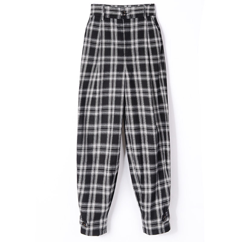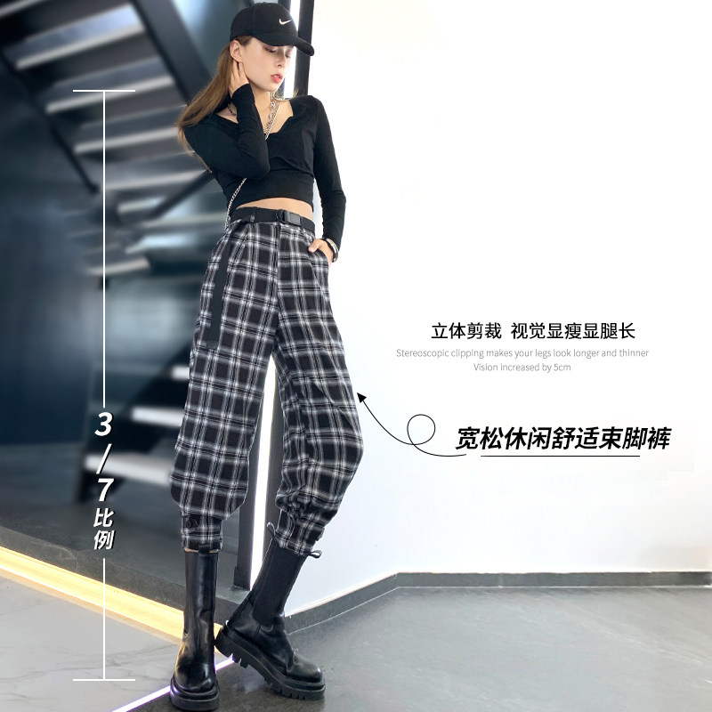 女高腰裤 休闲九分束脚加绒裤 春秋新款 宽松萝卜裤 子 韩版 格子哈伦裤