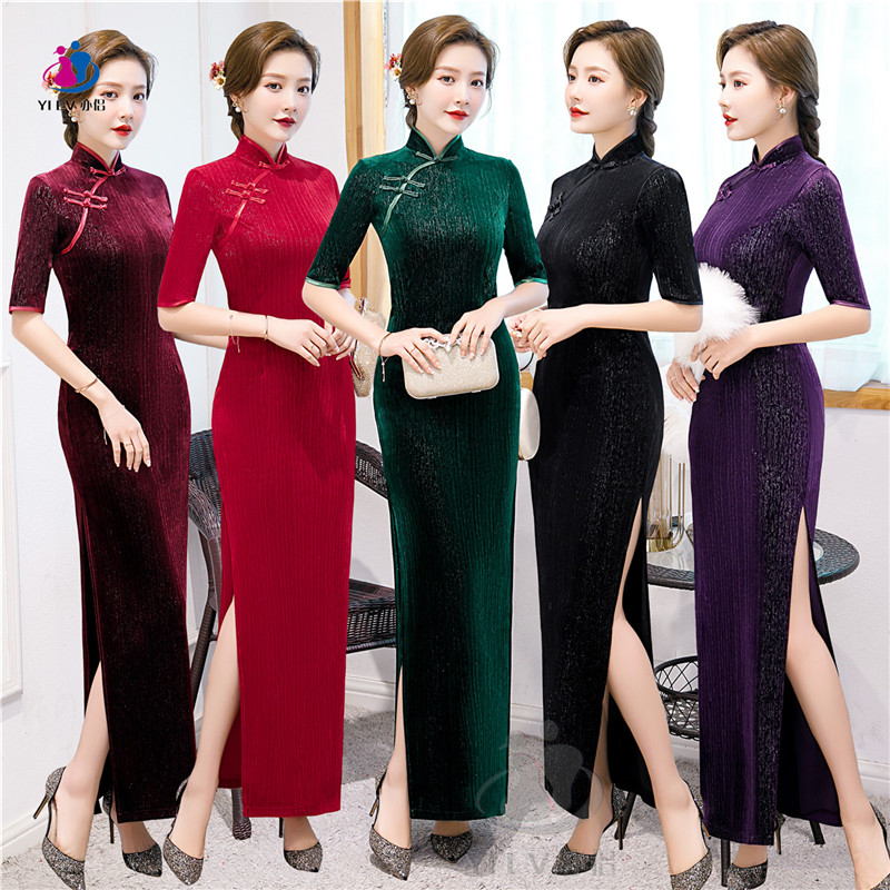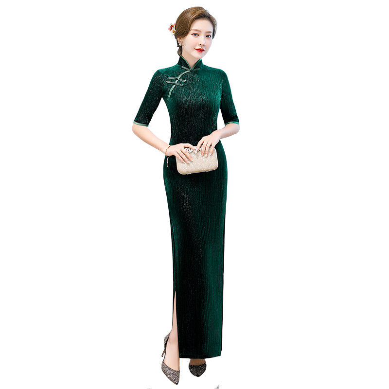 高端走秀旗袍2025新款 优雅 演出服墨绿色丝绒改良连衣裙气质年轻款