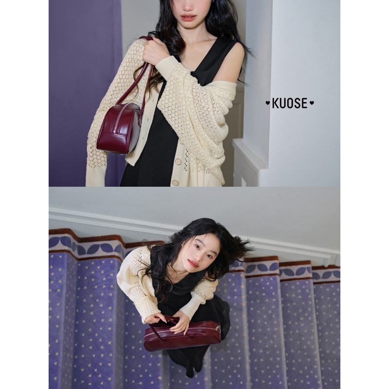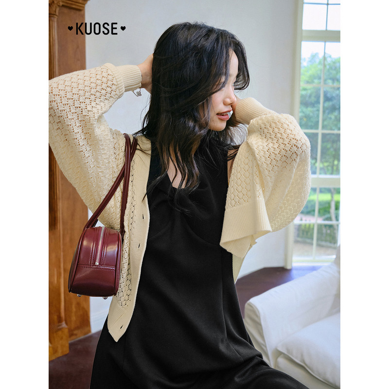 针织上衣 女2025秋冬新款 阔色镂空毛衣开衫 内搭收腰连衣裙两件套装