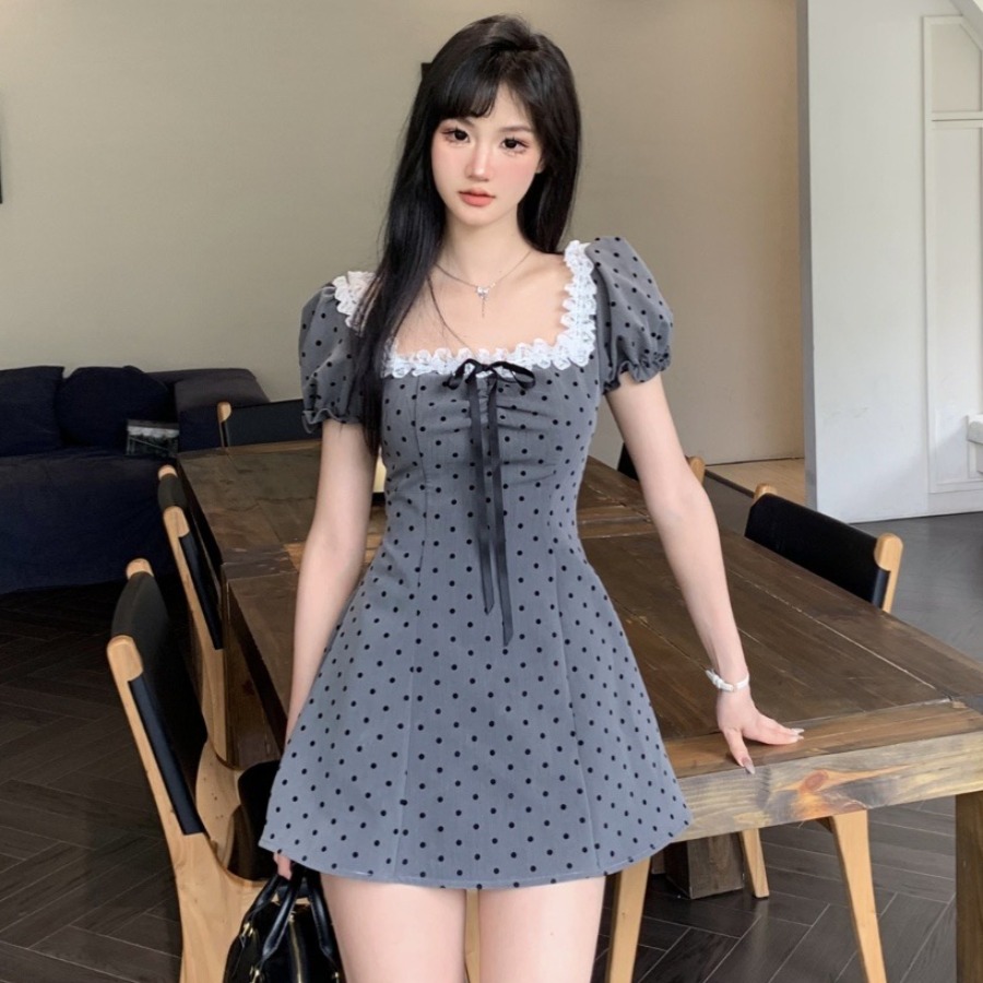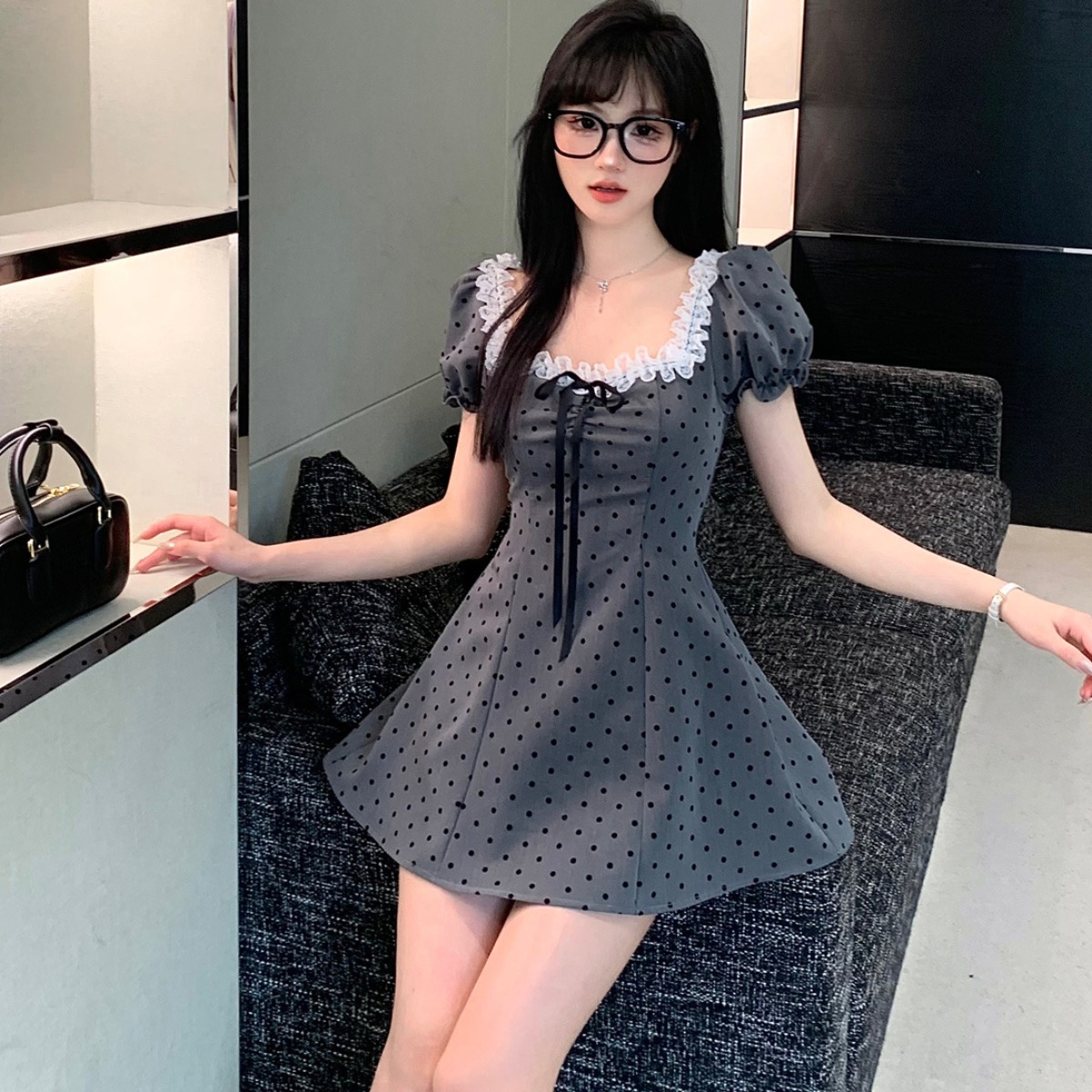 2025越韩小鱼 高干文女主灰色波点植绒小A摆收腰连衣裙 Miu系爱豆