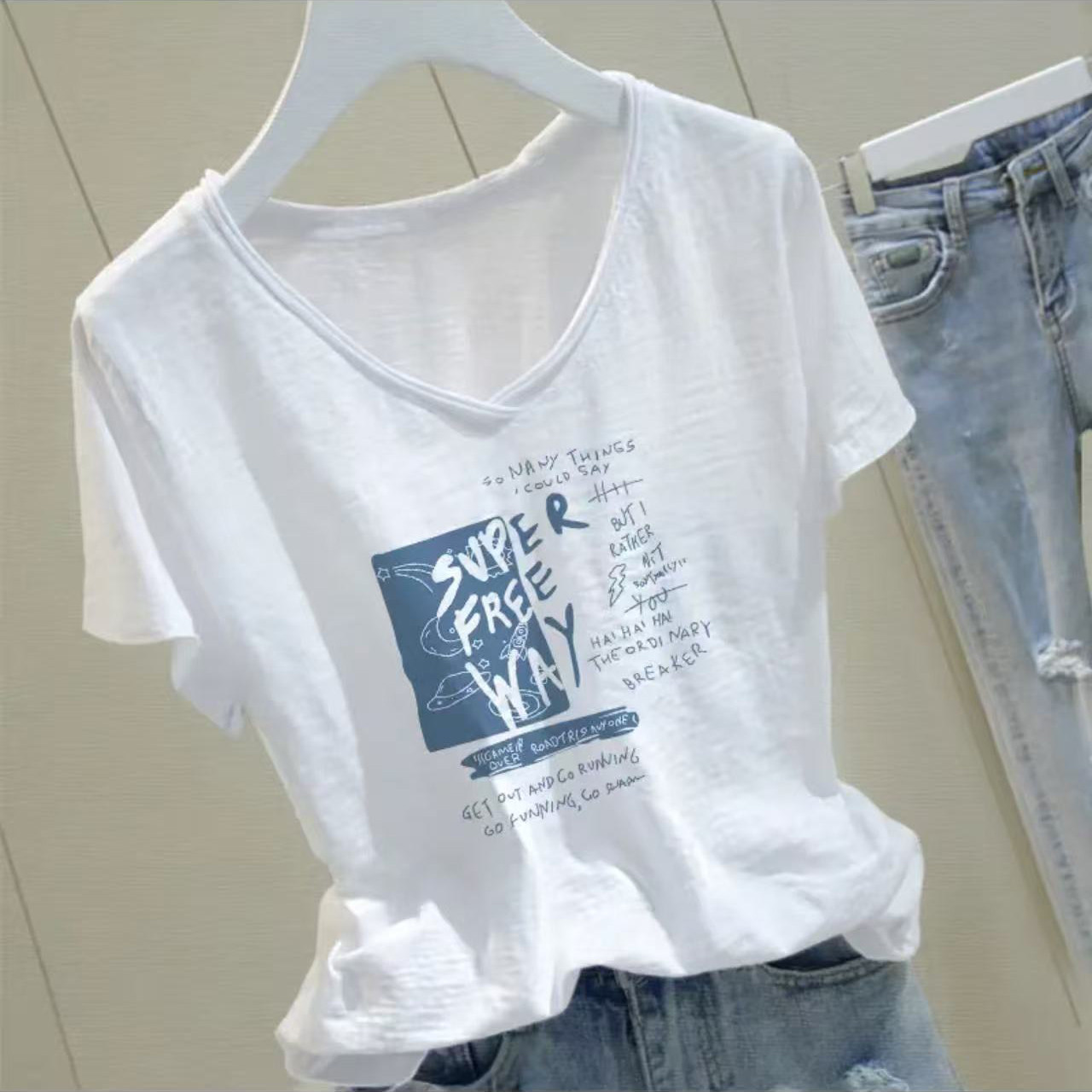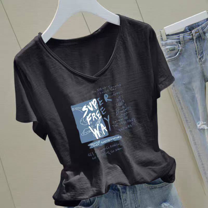 纯棉洋气宽松大码 竹节棉夏季 t恤女装 V领短袖 胖mm显瘦百搭上衣 新款