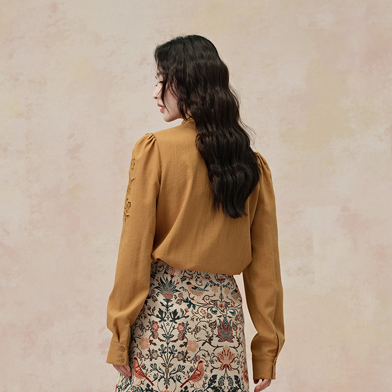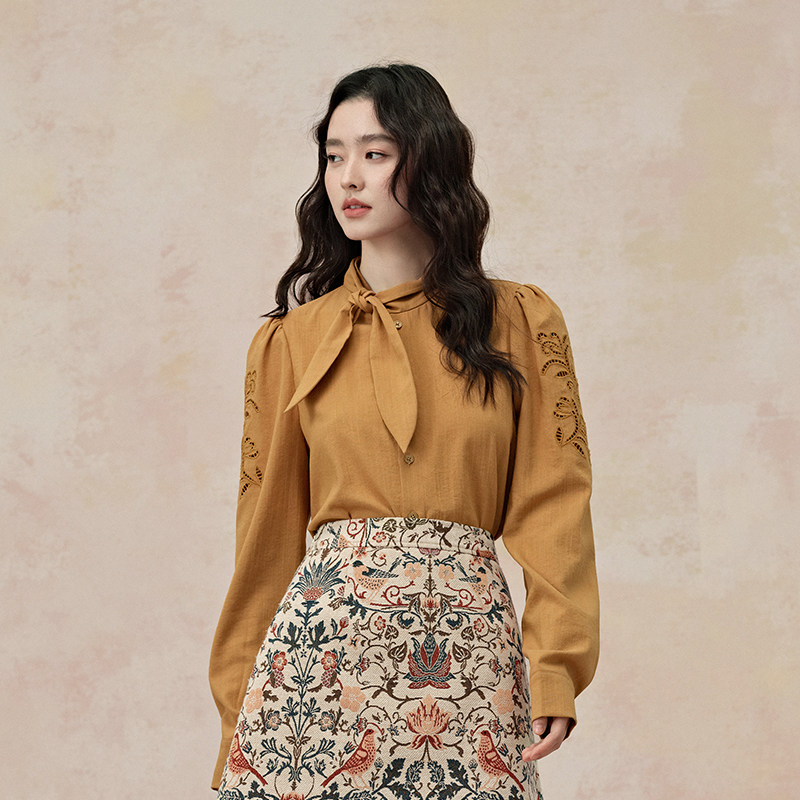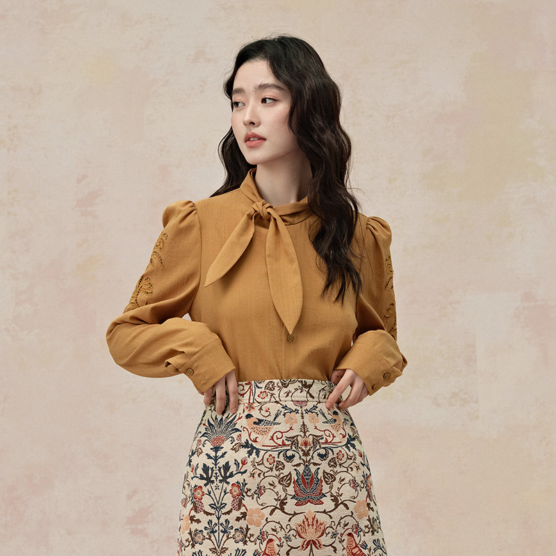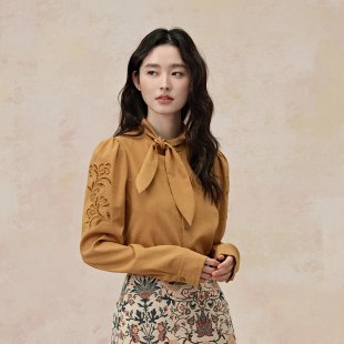 PIT纯色立领镂空领结长袖 女2026春休闲商务职业内搭上衣 衬衫