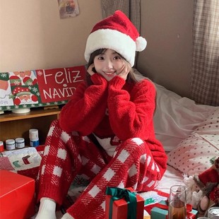 睡衣女秋冬季 软绵绵圣诞新年撞色条纹半边绒加厚法兰绒家居服套装