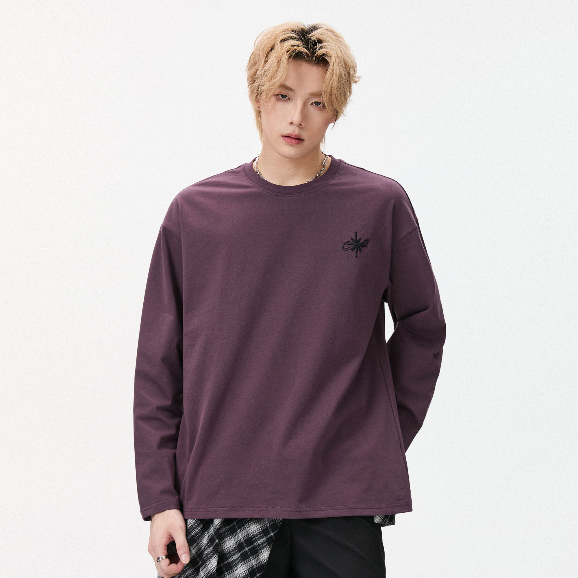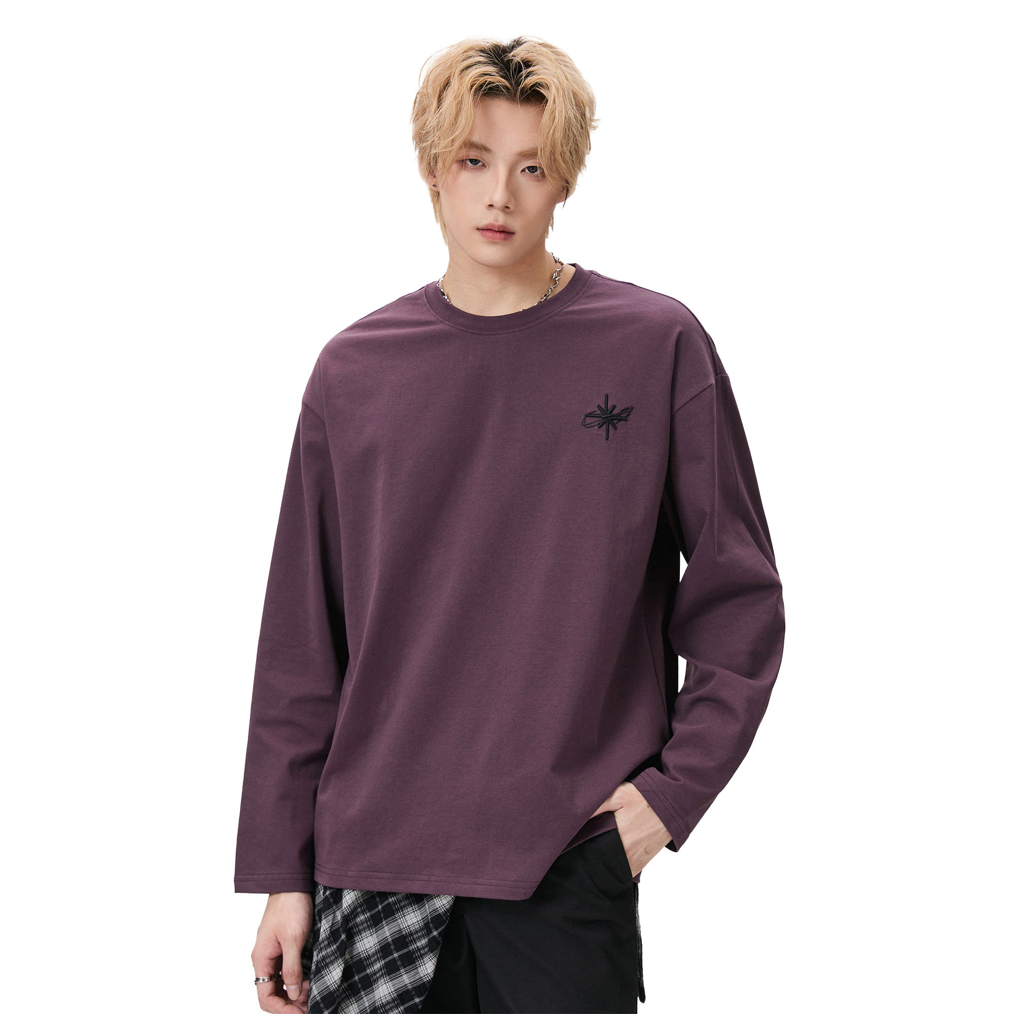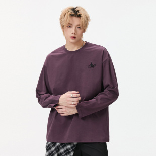 ALLIN T恤男春秋百搭宽松内搭情侣圆领纯色上衣 重磅刺绣落肩长袖