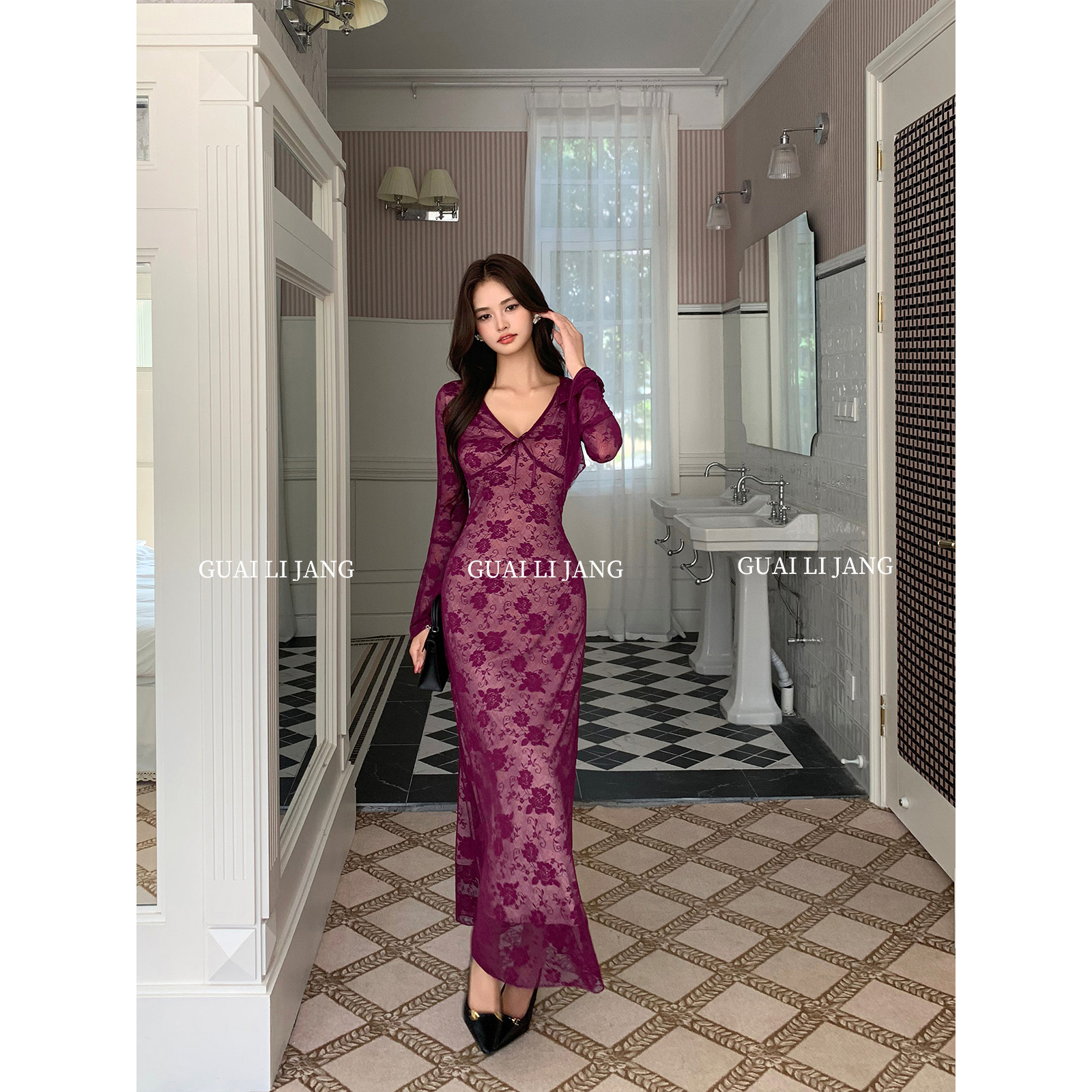 连衣裙女初秋高级感修身 V领蕾丝长袖 收腰性感包臀长裙 法式 怪力酱