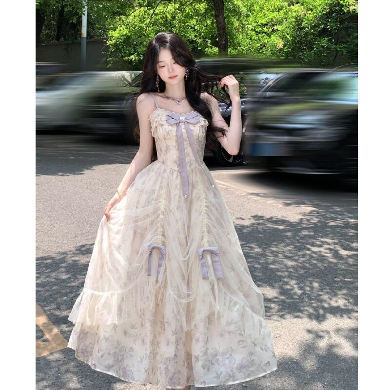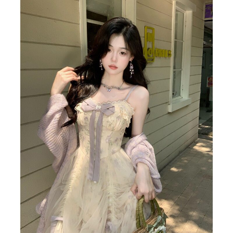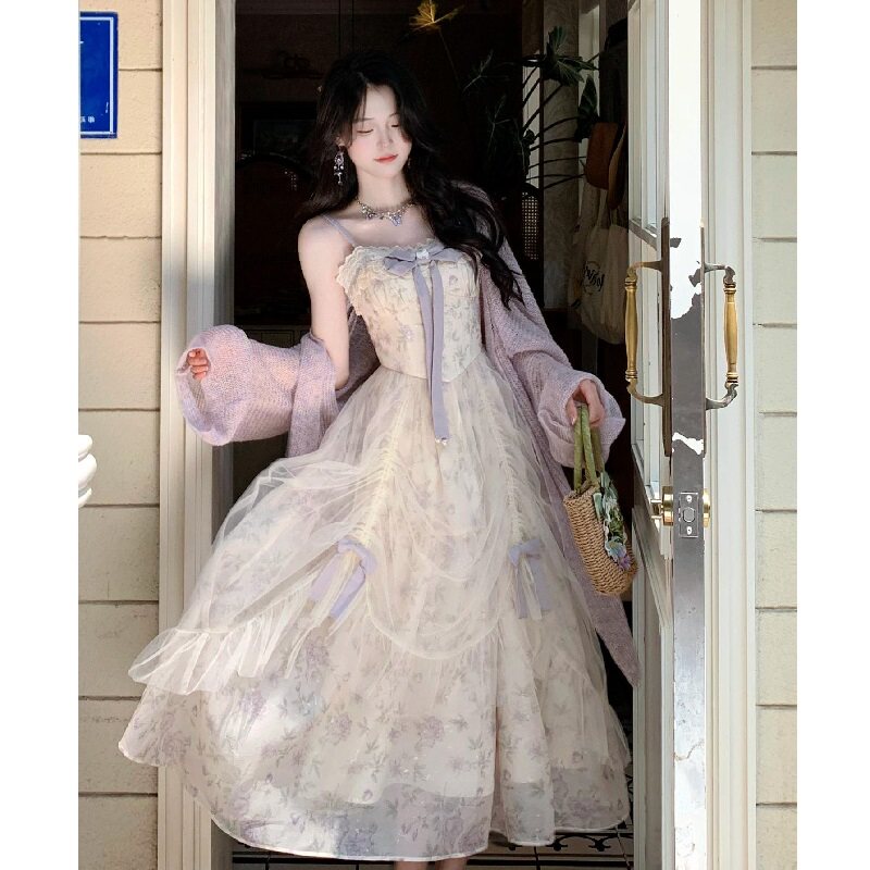 大码 女早秋仙女两件套 胖mm纯欲温柔紫色蝴蝶结碎花吊带连衣裙开衫