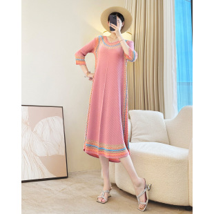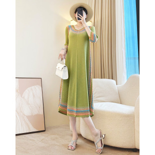 妈妈装 休闲洋气宽松显瘦褶皱连衣裙 复古印花长裙子女2026早春新款