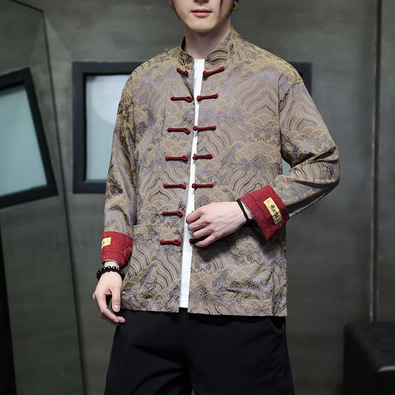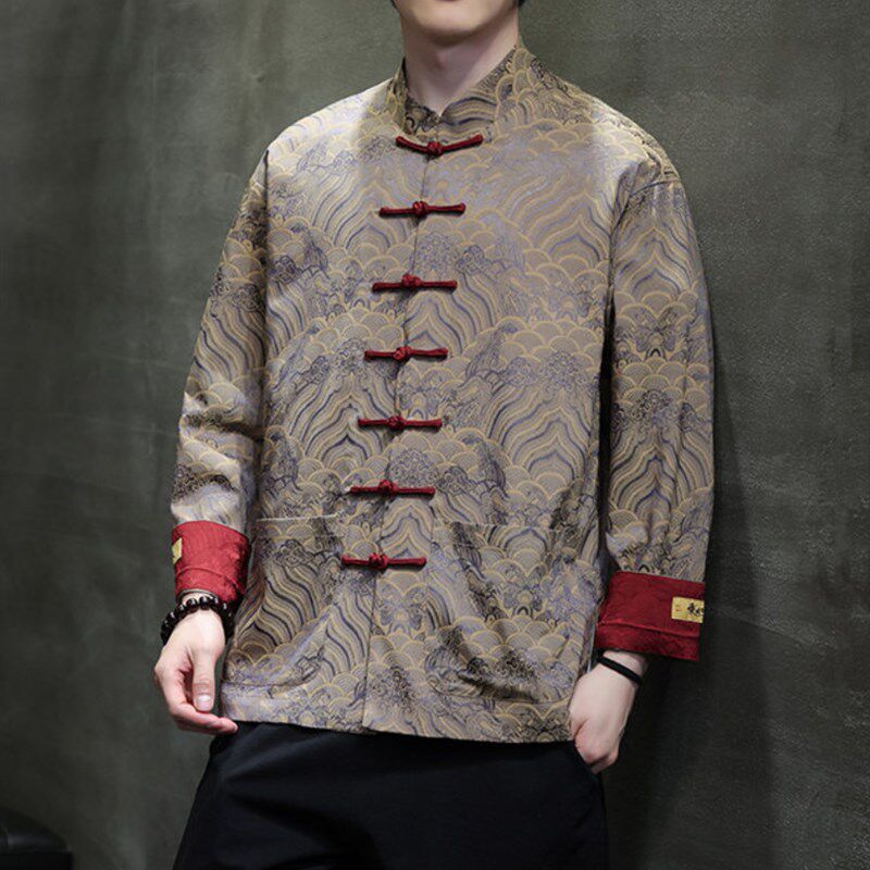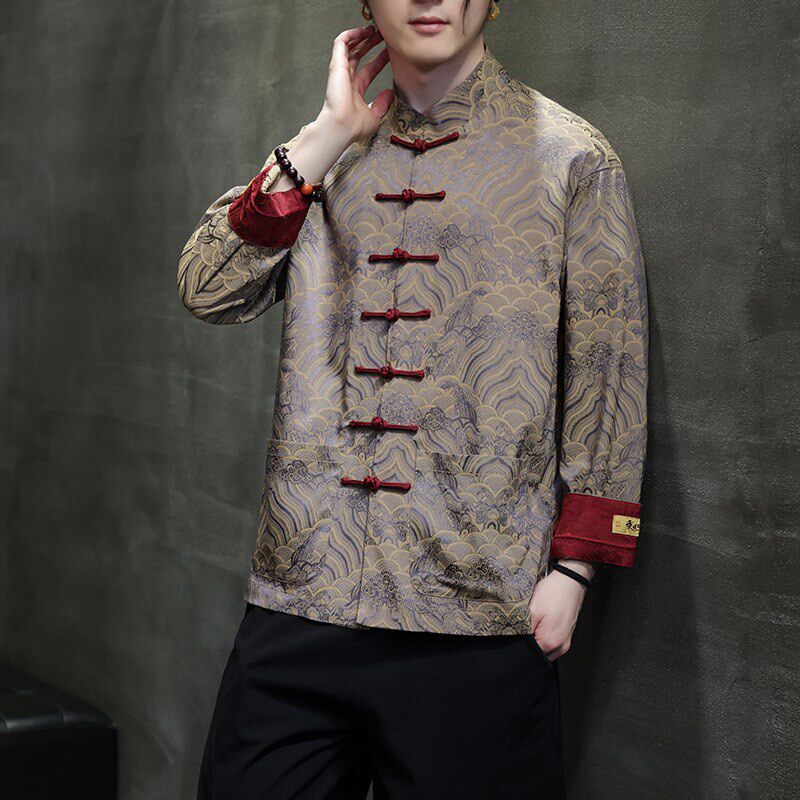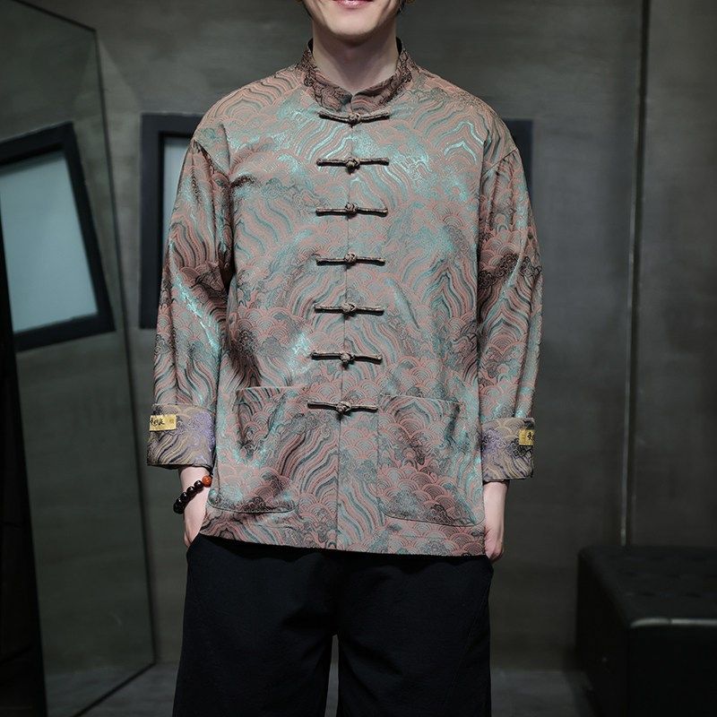 男提花立领宽松休闲复古外套中山装 新中式 衬衫 盘扣长袖 中国风唐装