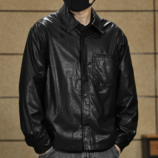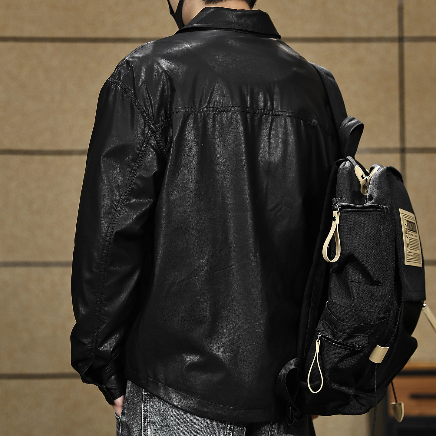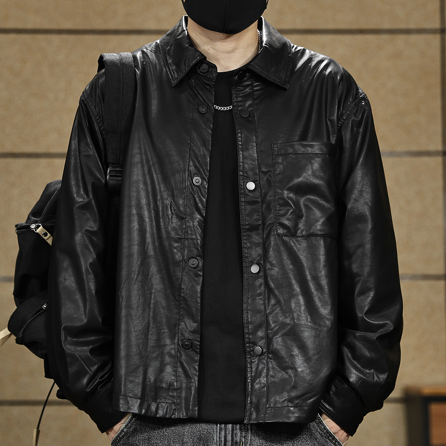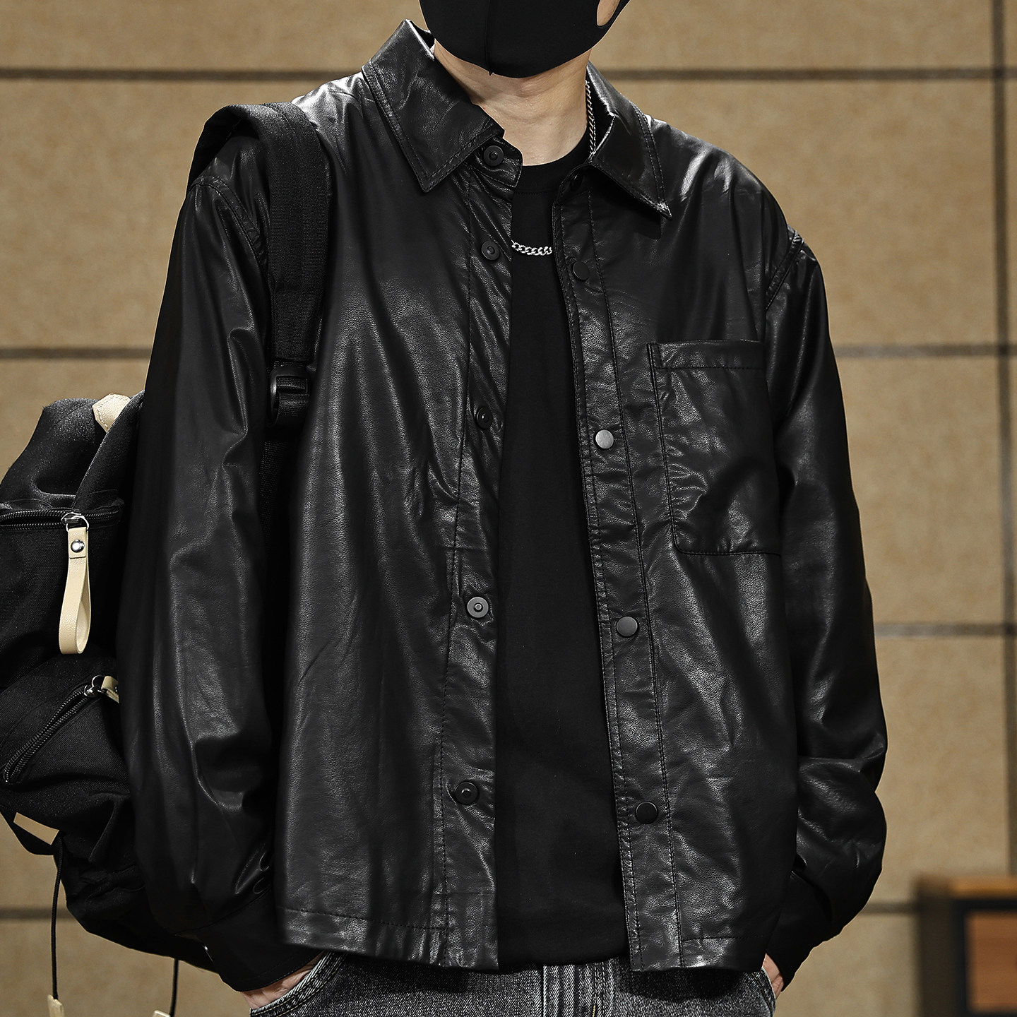 新款 美式 春秋季 外套男士 宽松百搭休闲机车皮衣夹克男 复古翻领衬衫