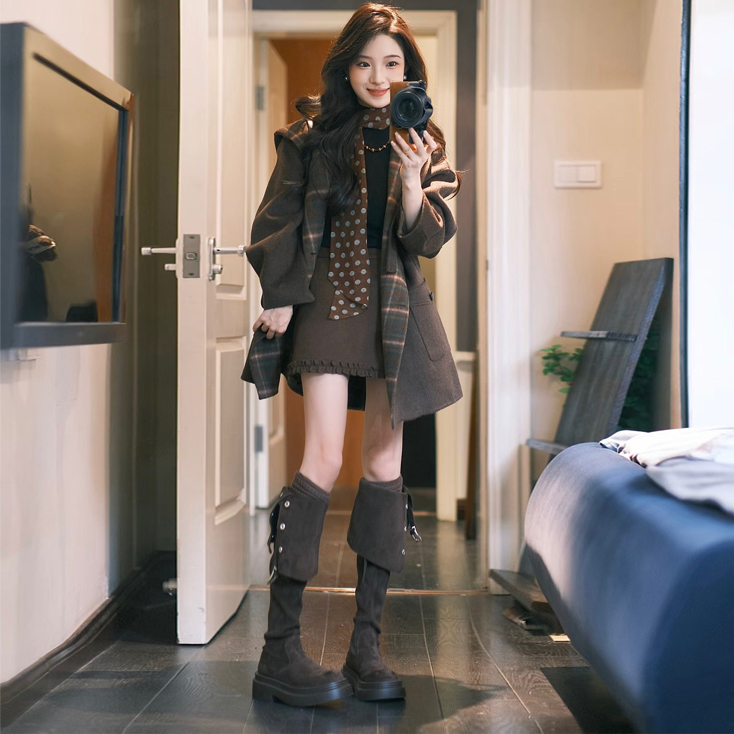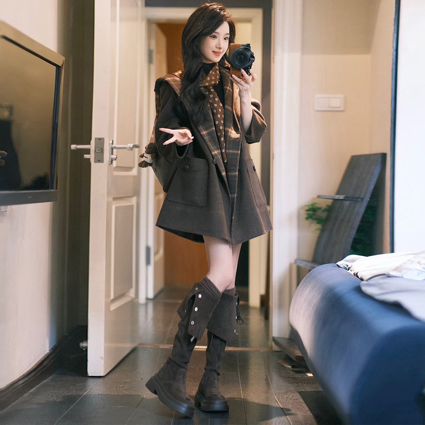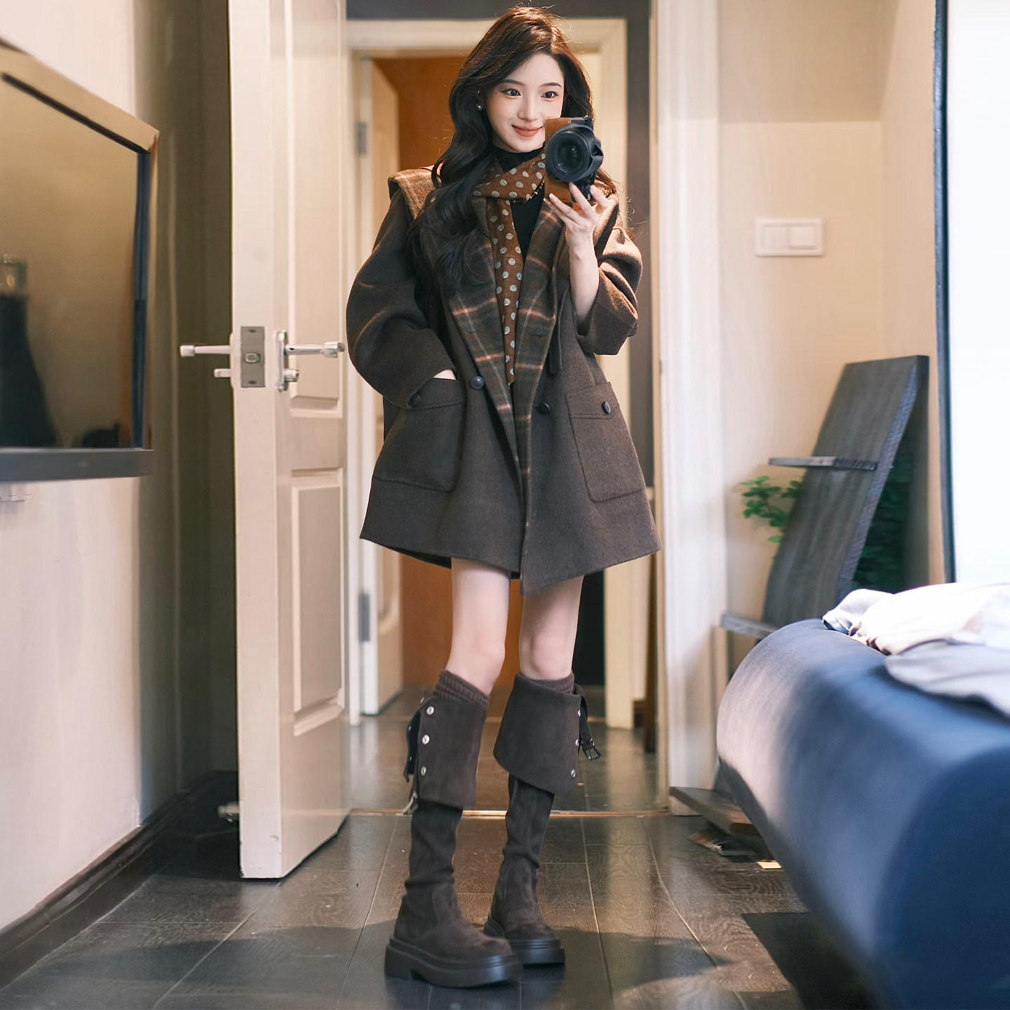 显瘦百搭呢子大衣 中长款 高级感咖色撞色连帽毛呢外套女秋冬装 新款