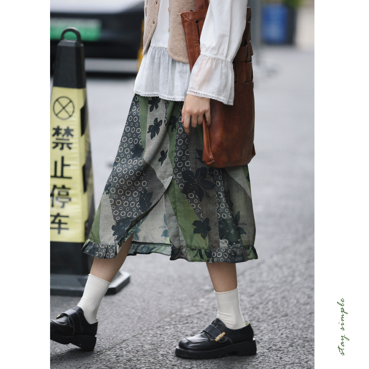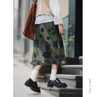 花吉Q562苔藓绿森林木耳边文艺复古直筒半身裙2026新款 秋开衩半裙