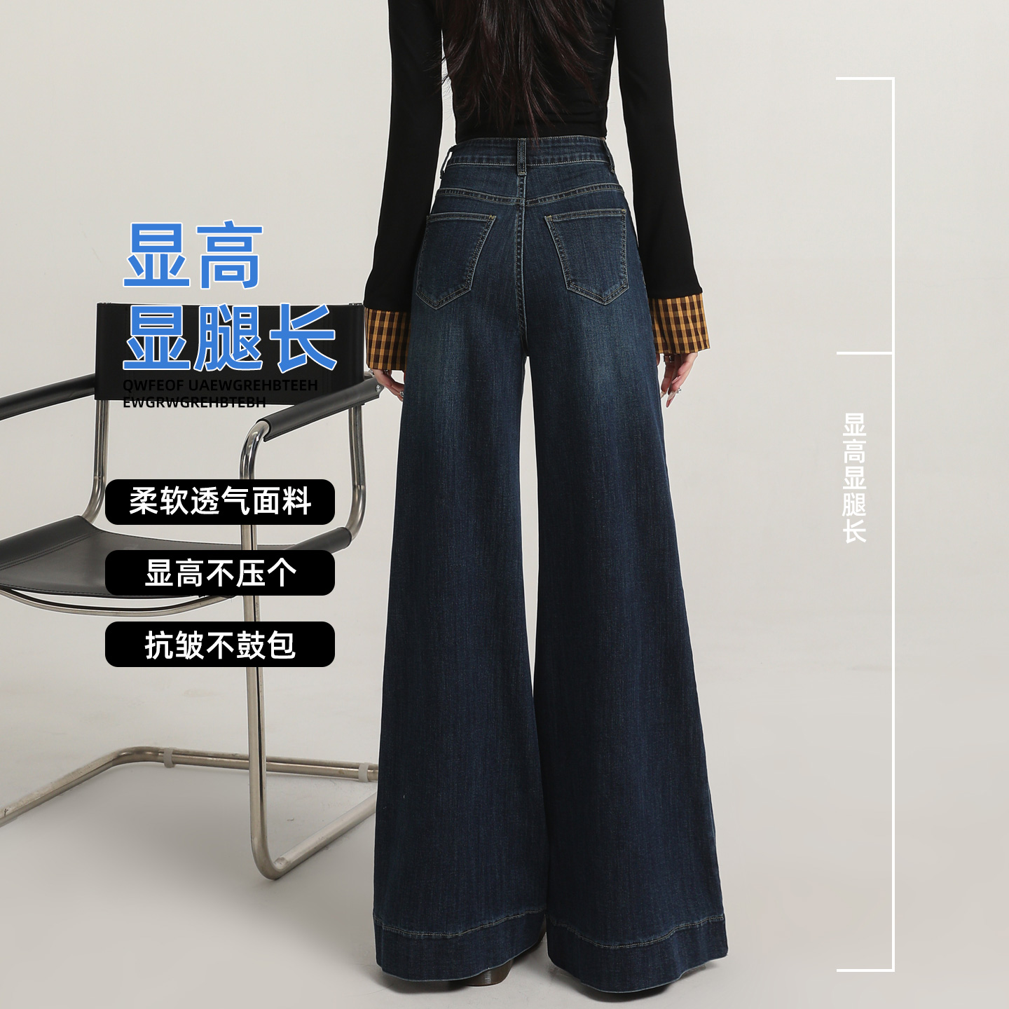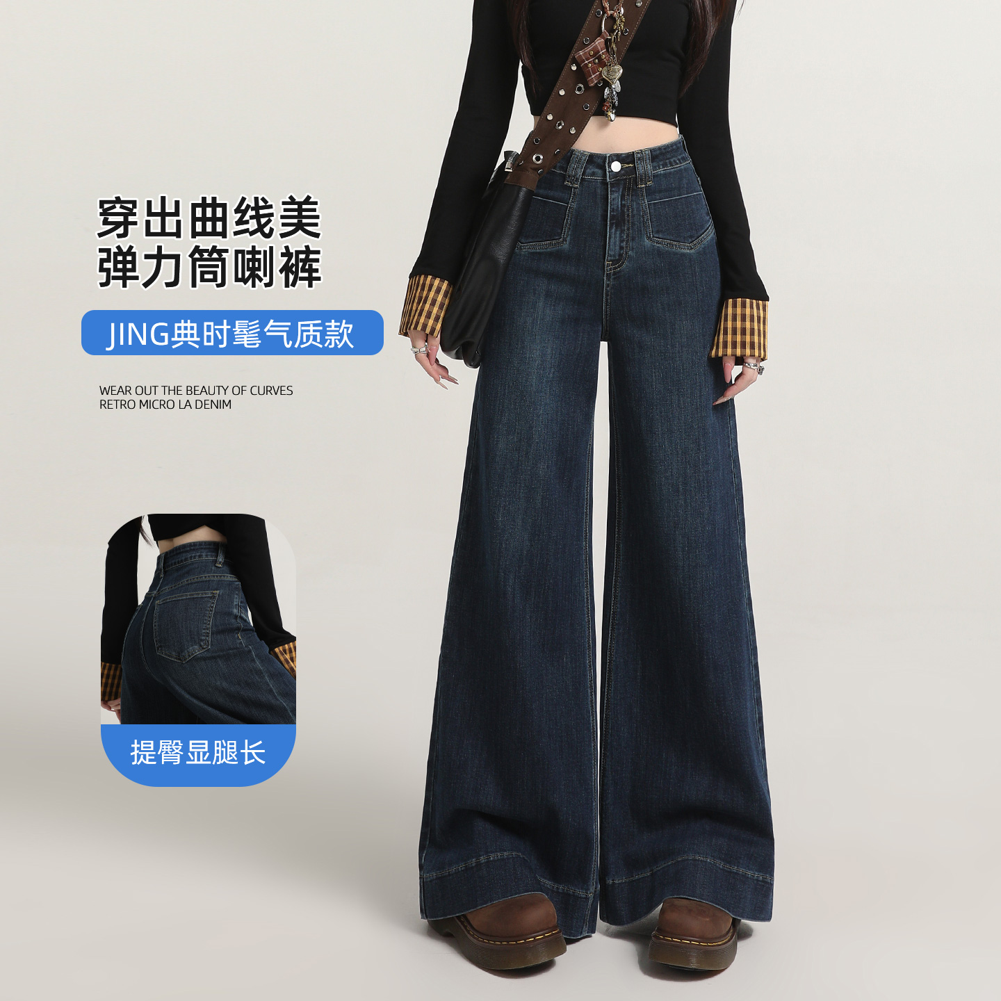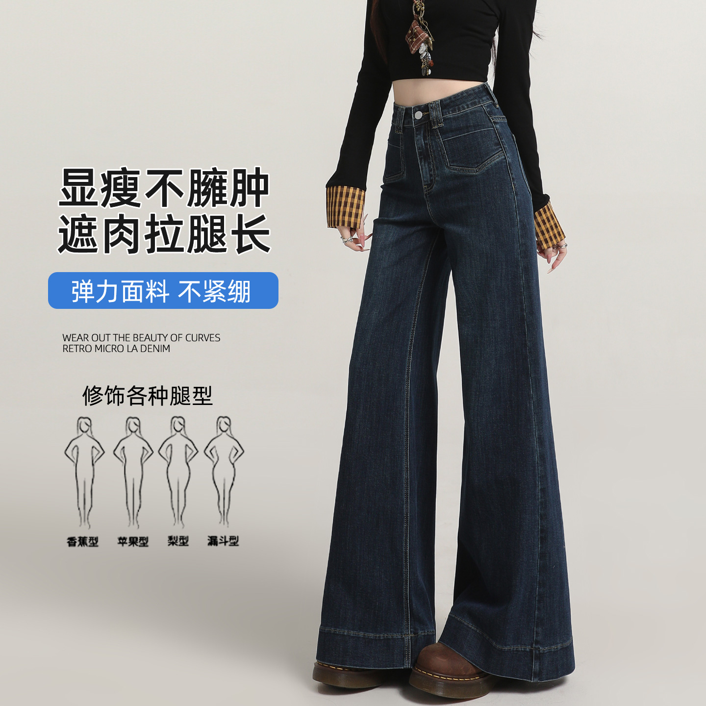 深蓝设计感小众垂感复古不贴腿水洗阔腿喇叭裤 微喇牛仔裤 女春秋款