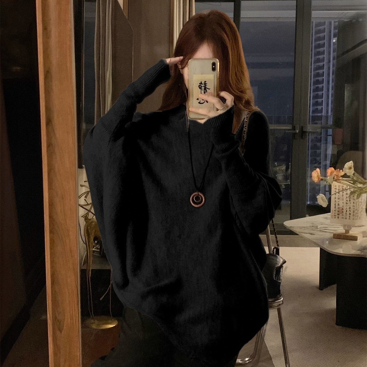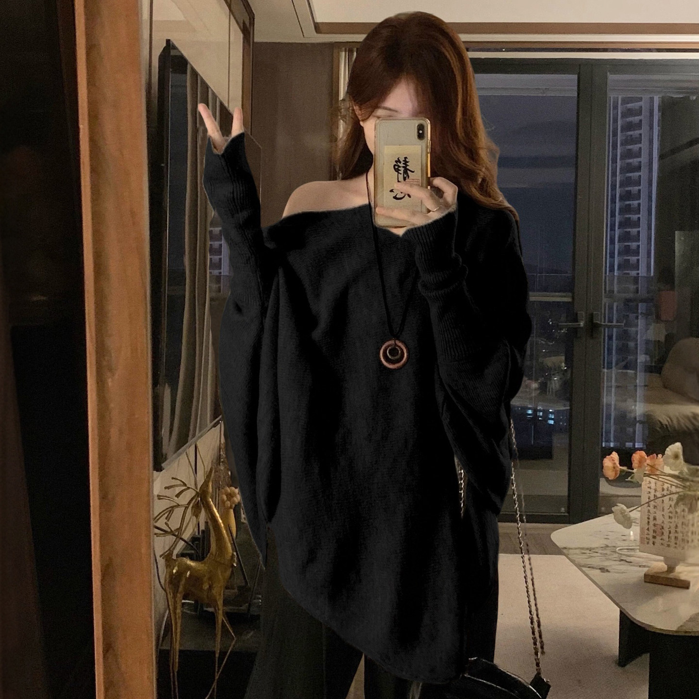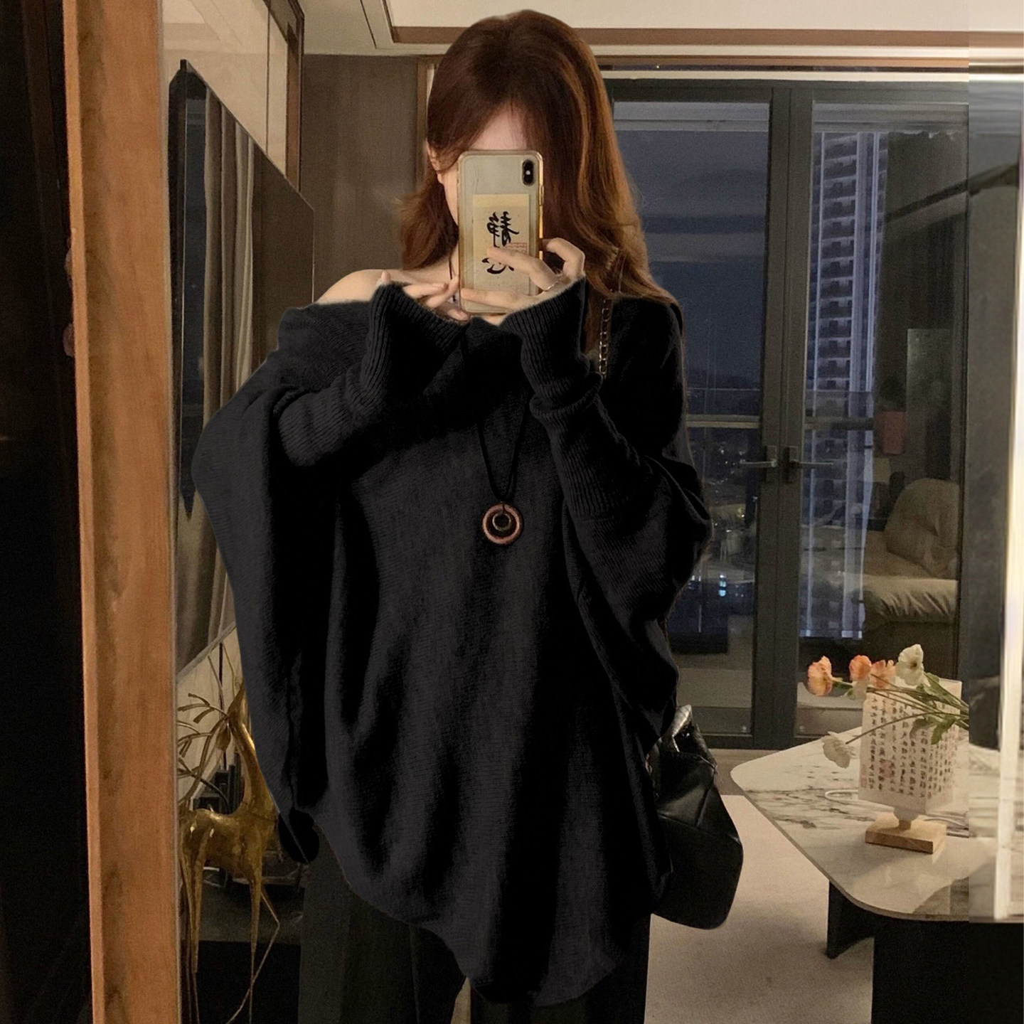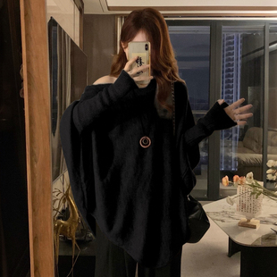 针织衫 胖mm慵懒风斜肩蝙蝠袖 女宽松显瘦百搭黑色休闲上衣 女装 大码