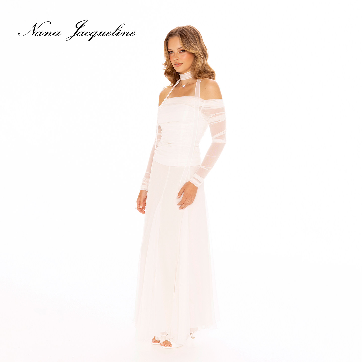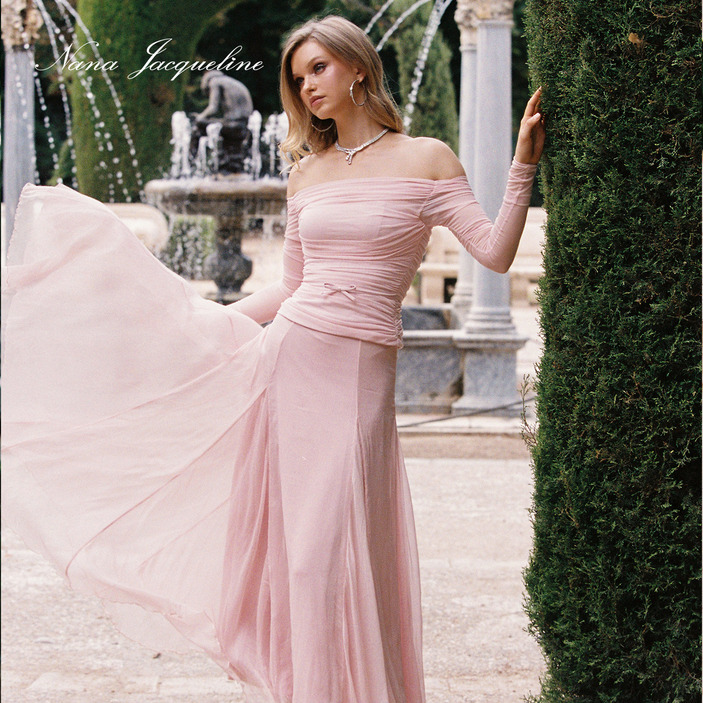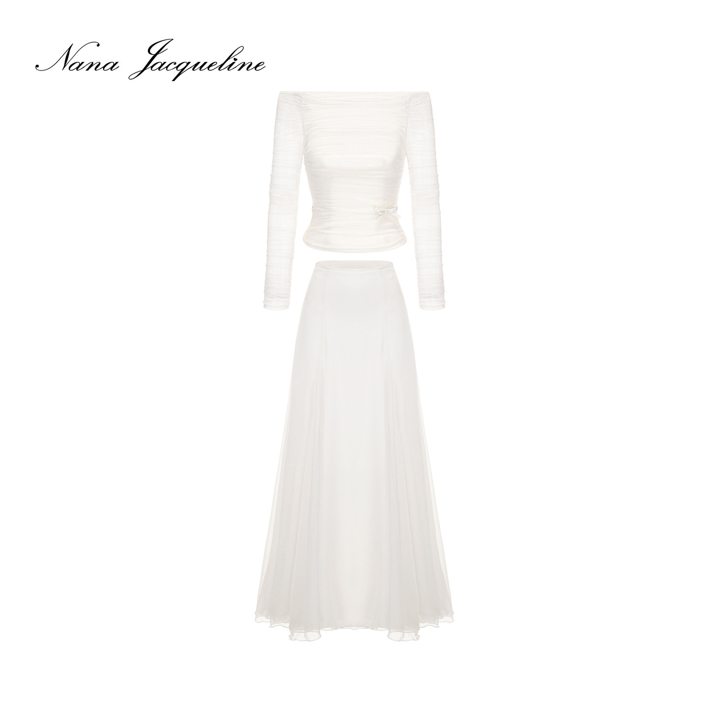 微透长袖 女新款 蝴蝶结一字肩上衣网纱半裙 套装 NanaJacqueline时尚