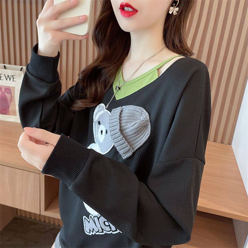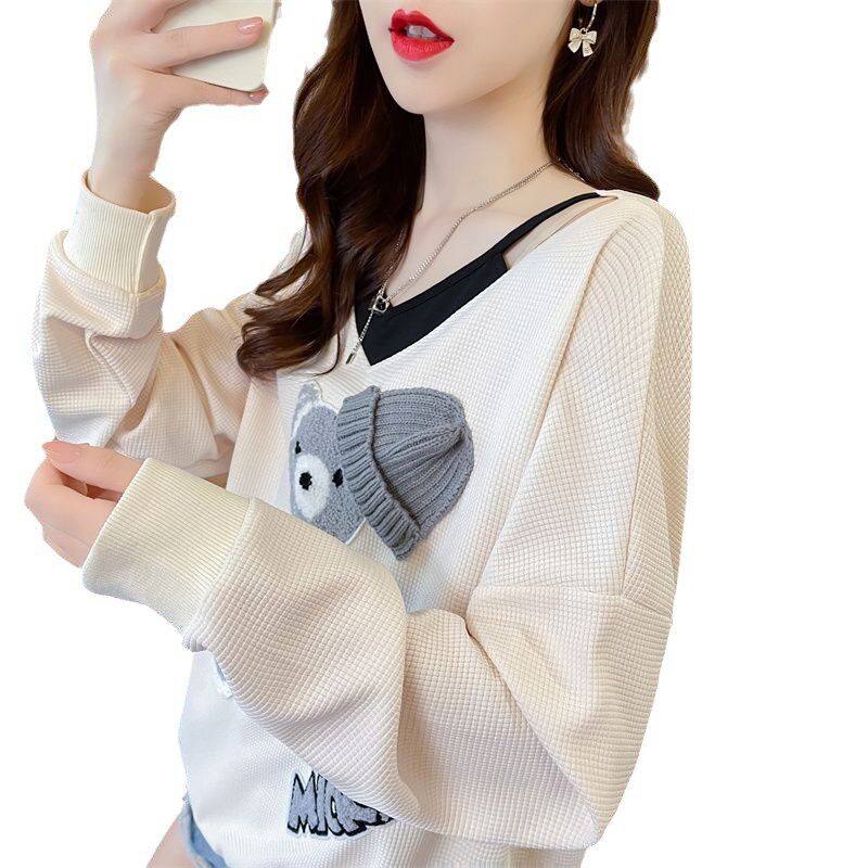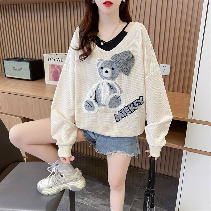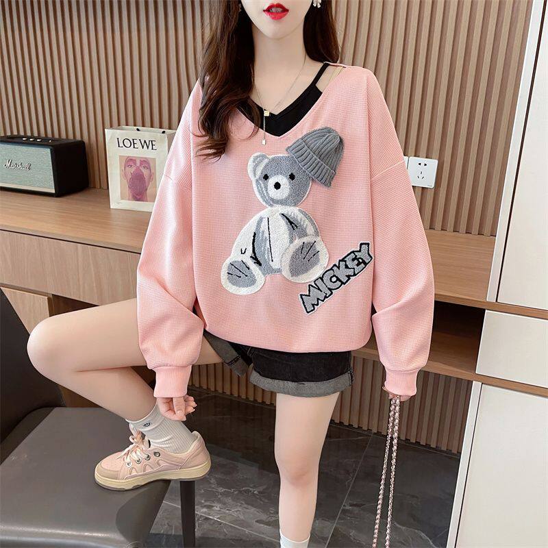 卡通2025新款 长袖 宽松v领卫衣女潮 外贸胖妹妹大码 华夫格卫衣女式