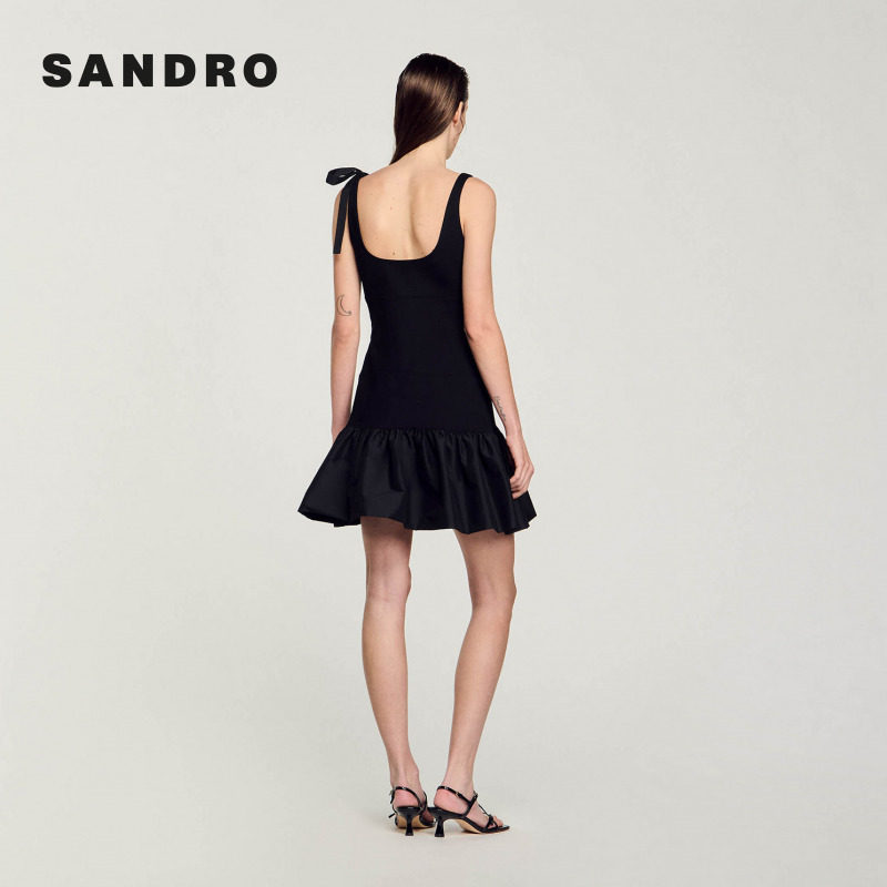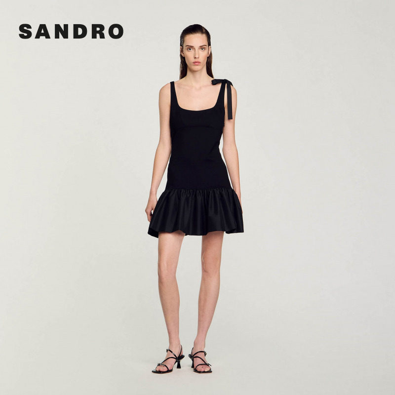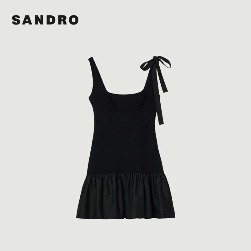 单边系带黑色荷叶边短款 SANDRO2025春季 气质修身 法式 连衣裙 女装
