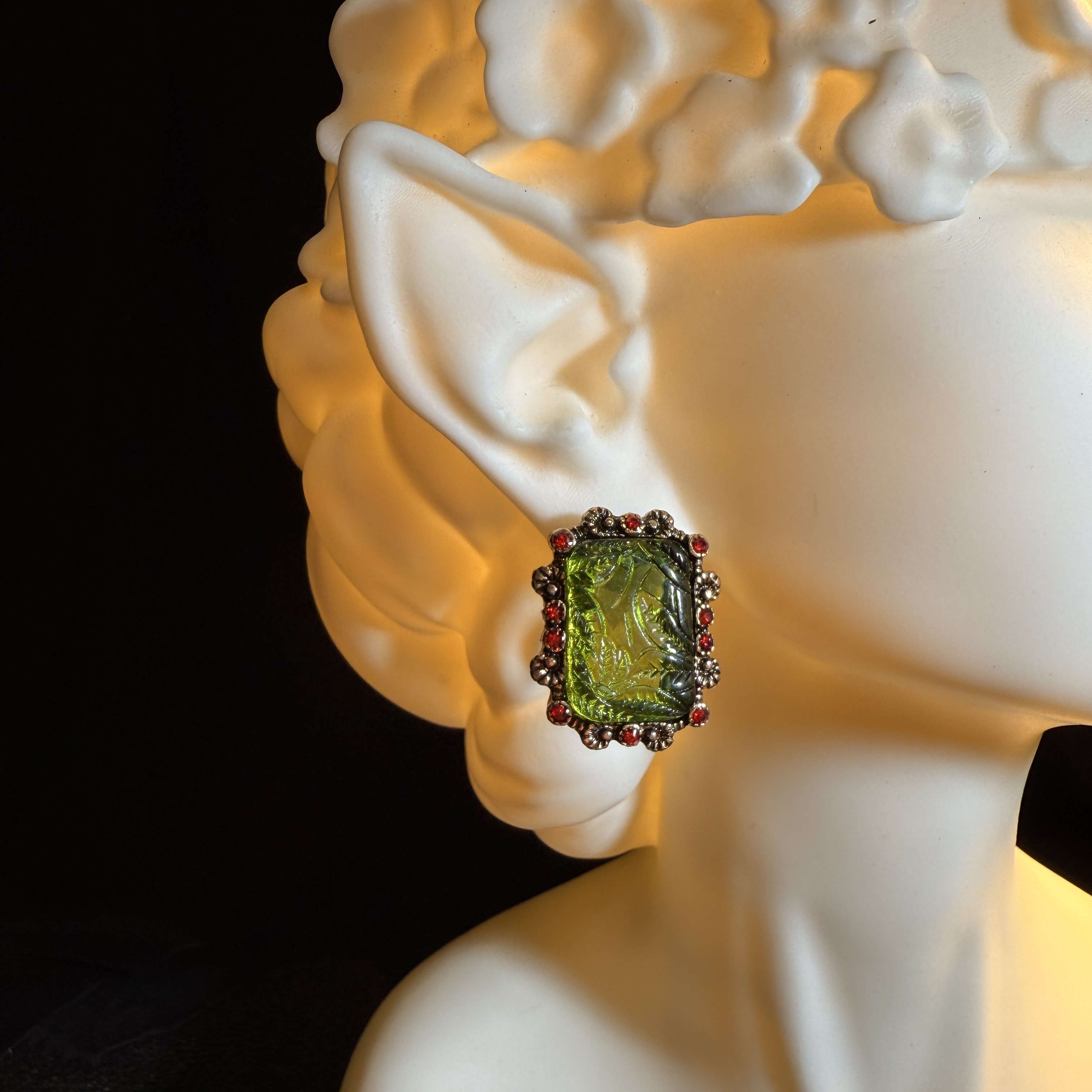 橄榄 耳环 Vintage古着 Bloom绿色琉璃花边耳钉 耳饰 Onyx 开花