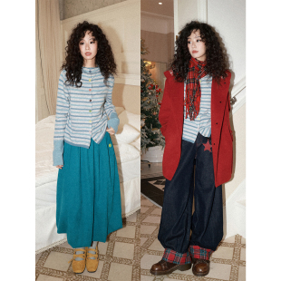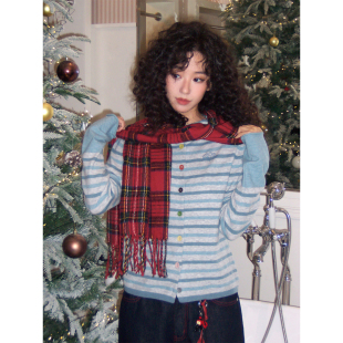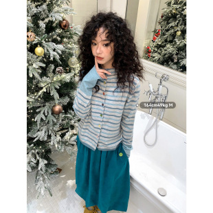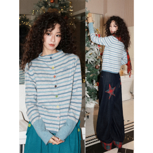 上衣 长袖 化学少女「糖果纸」绵羊毛蓝色条纹开衫 外穿毛衣女春修身