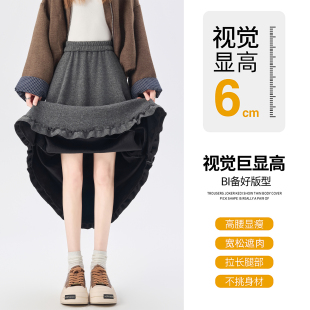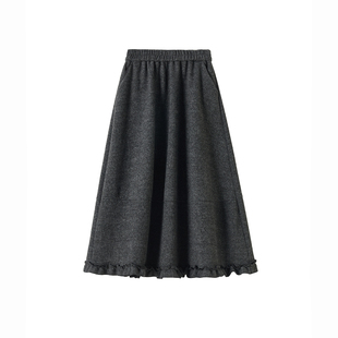 深灰色木耳边拼接半身裙女秋冬季 加厚A字中长裙松紧腰加绒毛呢裙