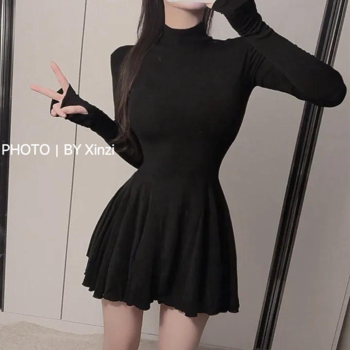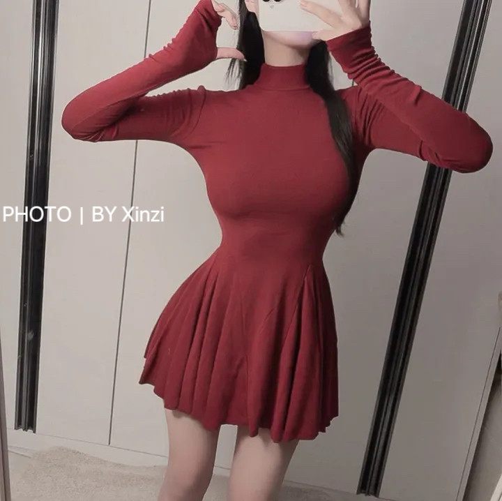 收腰显瘦百搭百褶蓬蓬短裙 连衣裙女修身 辛子韩国代购 纯欲高领长袖