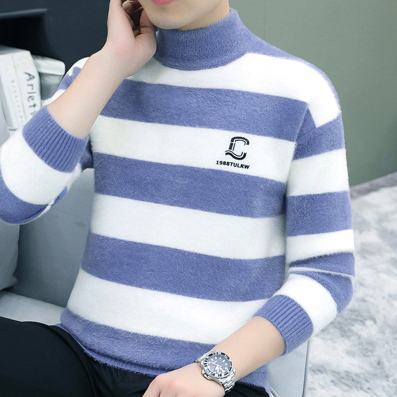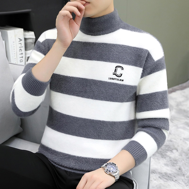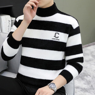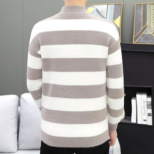 保暖冬装 条纹拼接半高领水貂绒男士 中领打底衫 新款 毛衣2025秋冬季