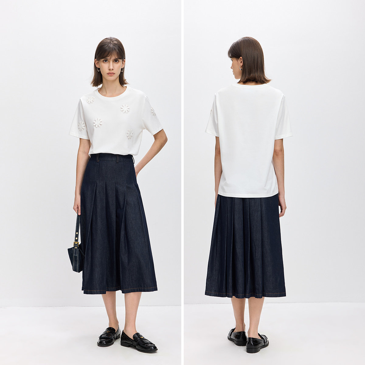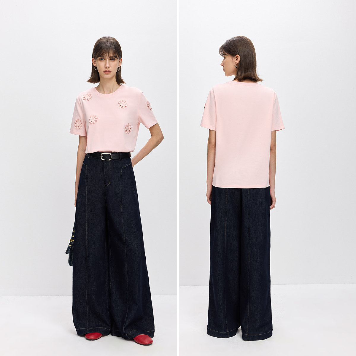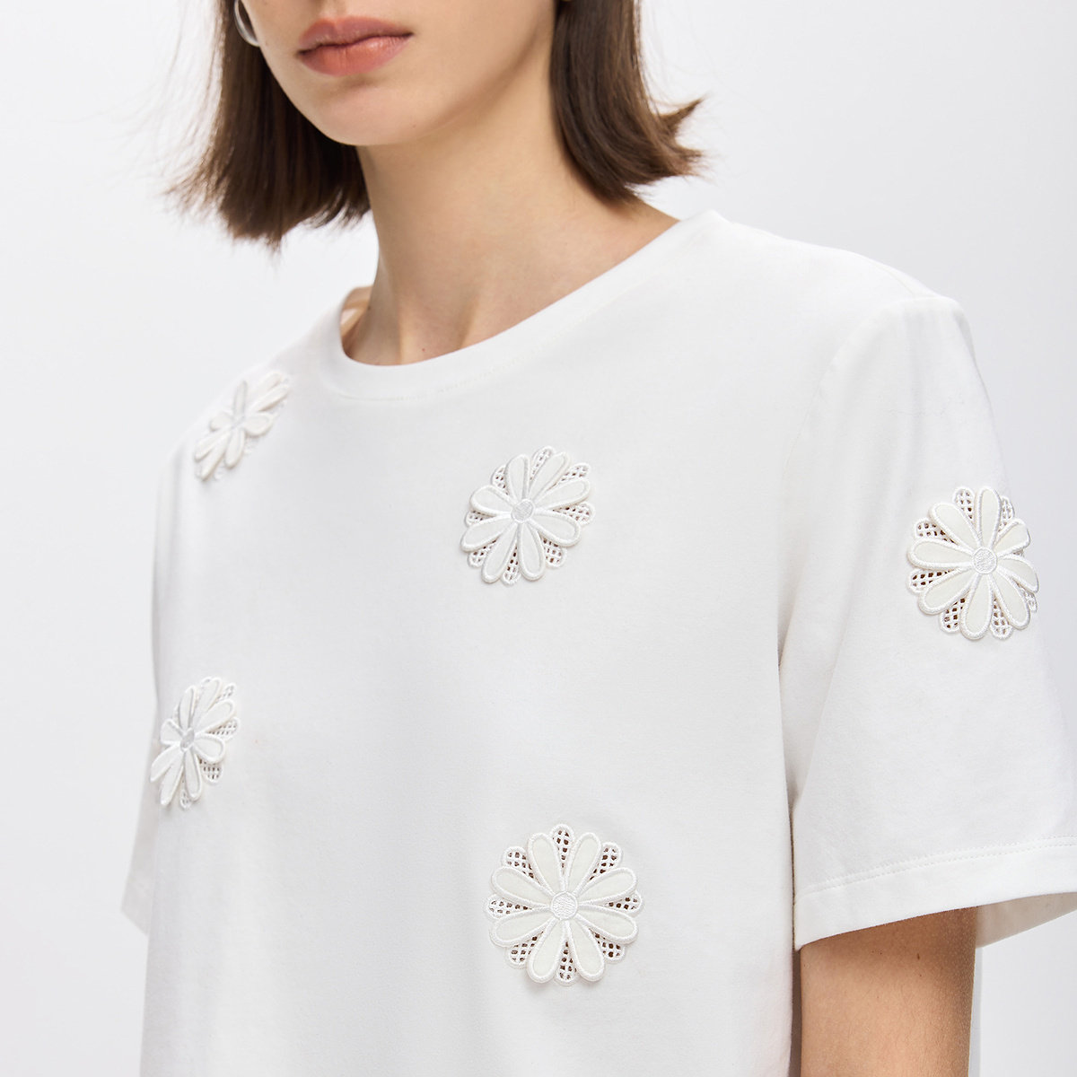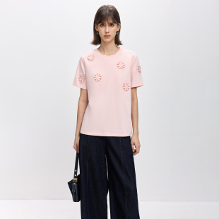 LILY2026春新款 T恤女 简约立体花朵刺绣镂空通勤休闲圆领套头短袖