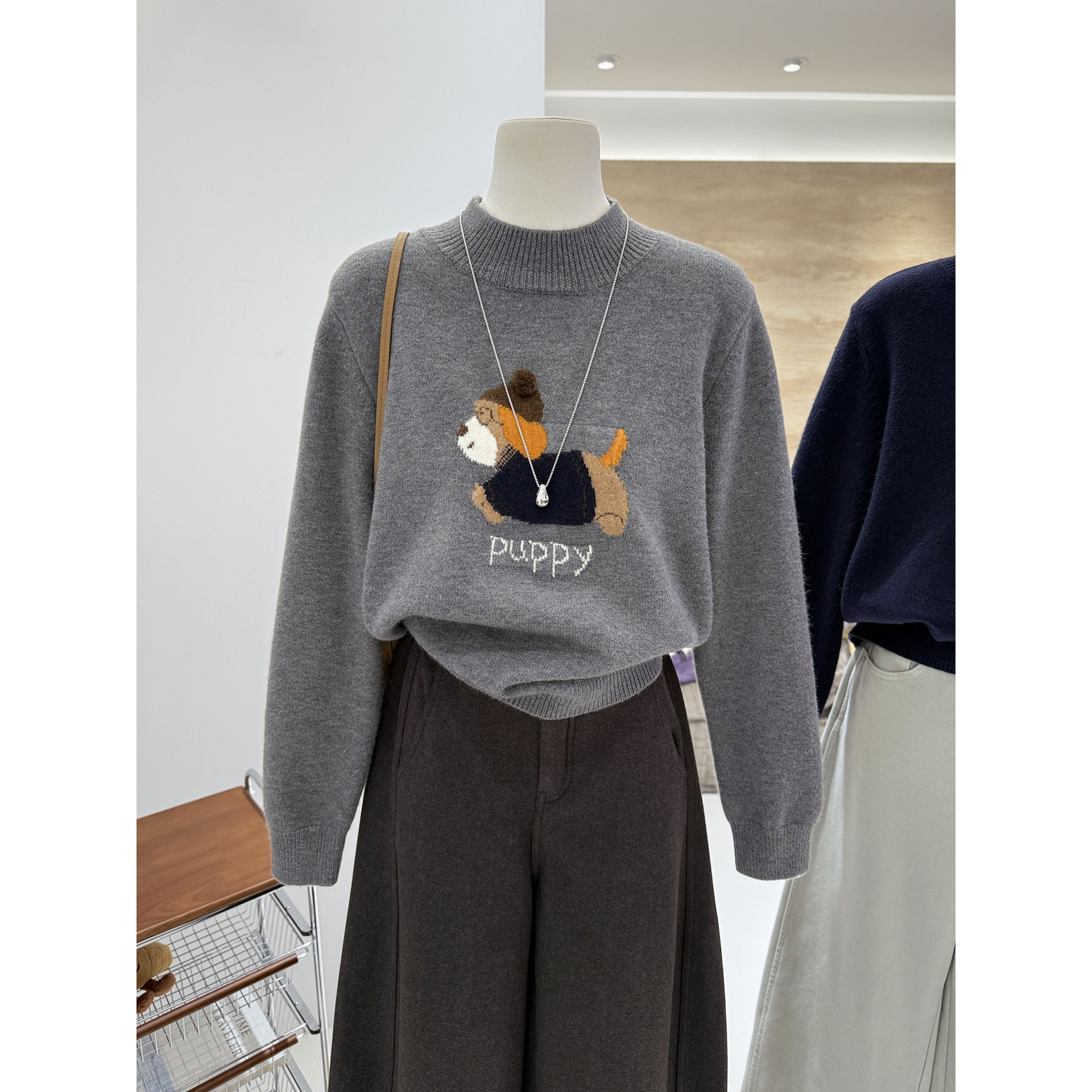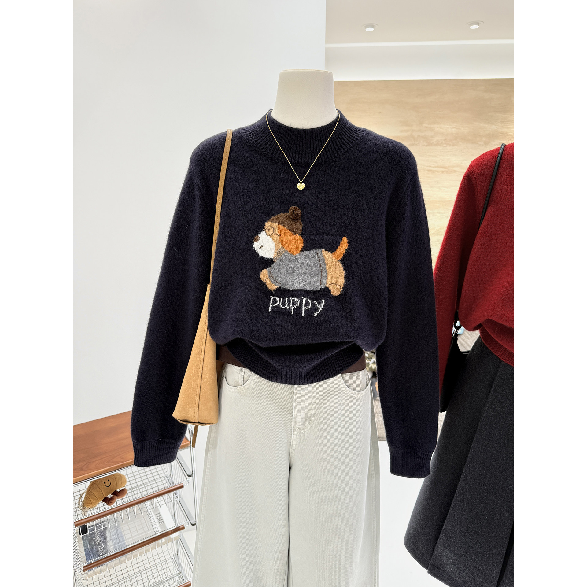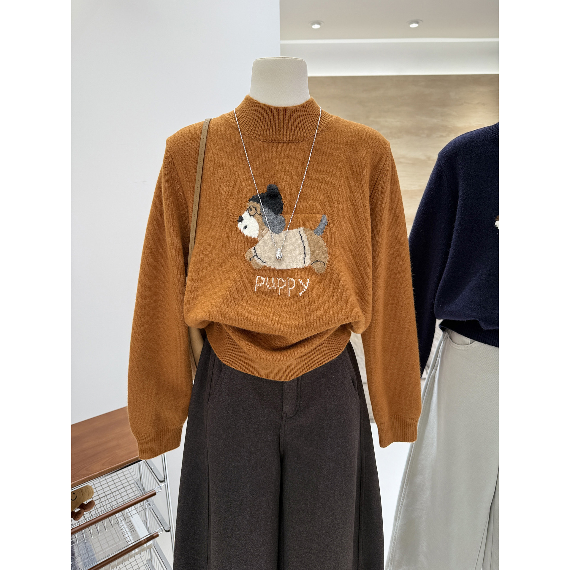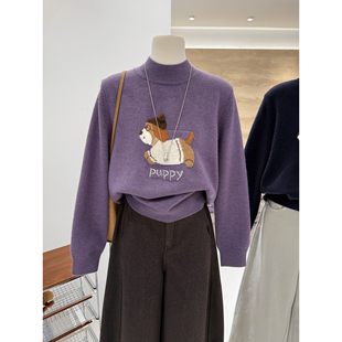 半高领秋冬新款 韩系卡通减龄小狗提花宽松显瘦保暖针织套头毛衣女