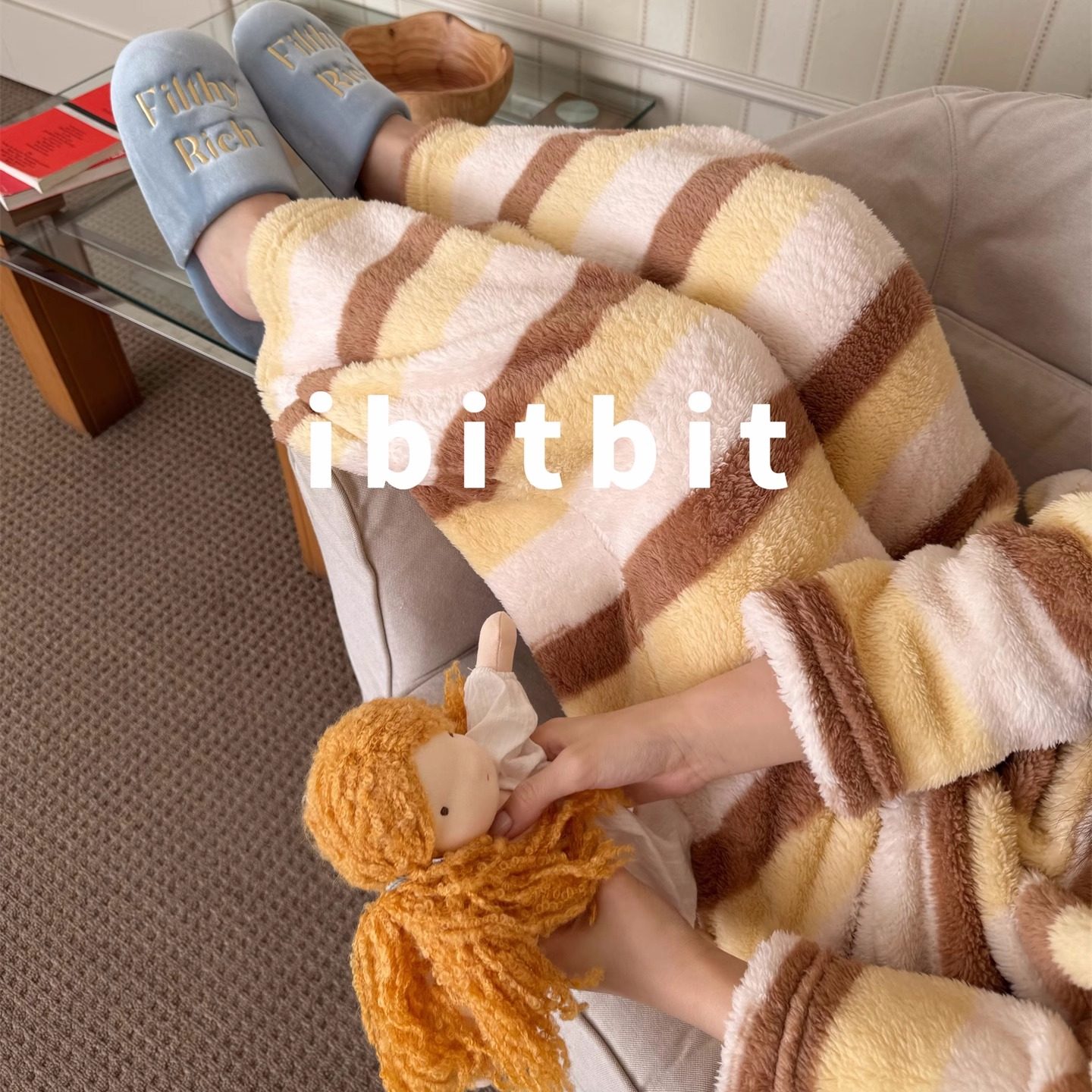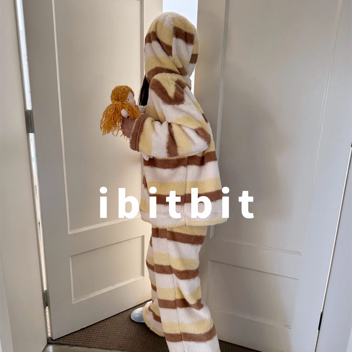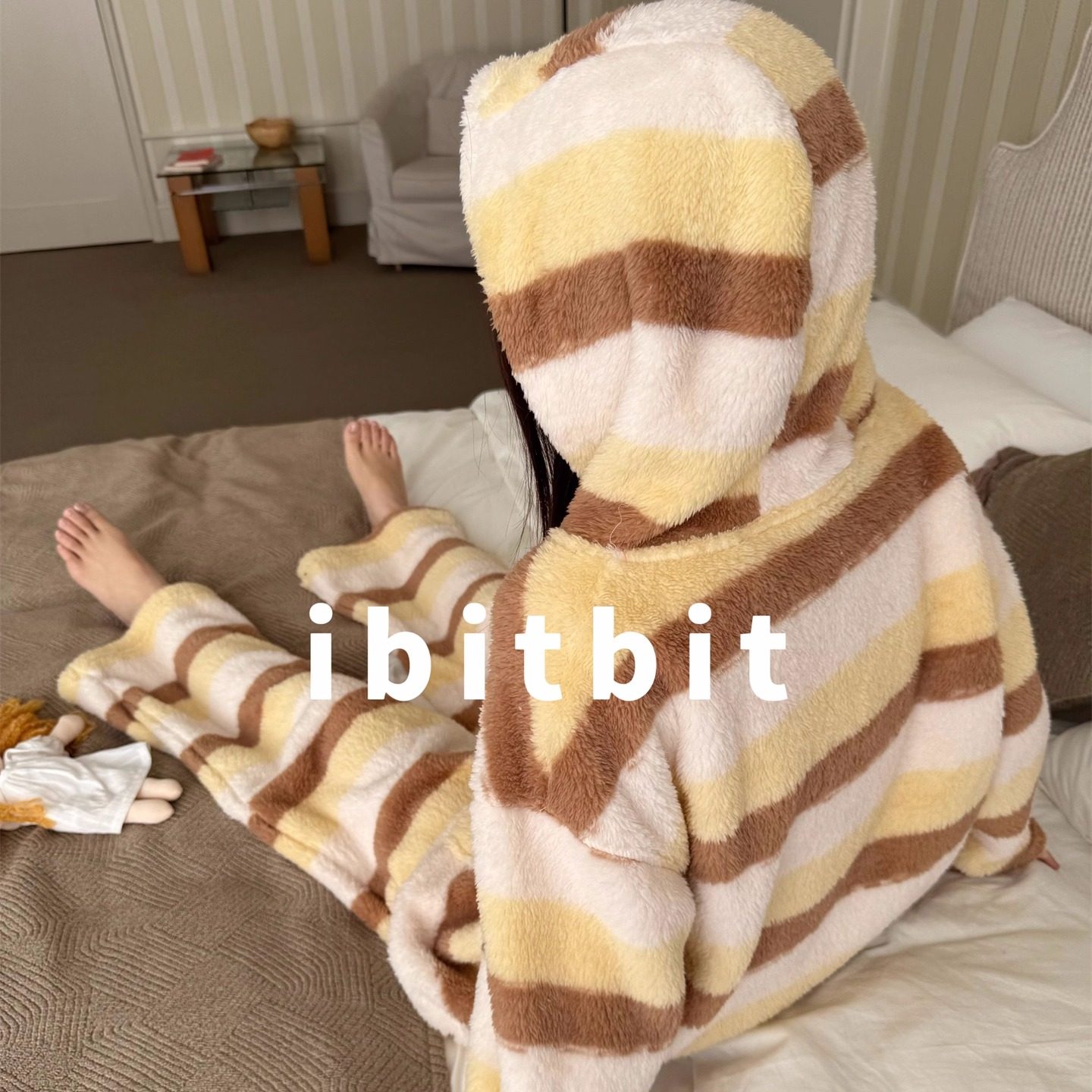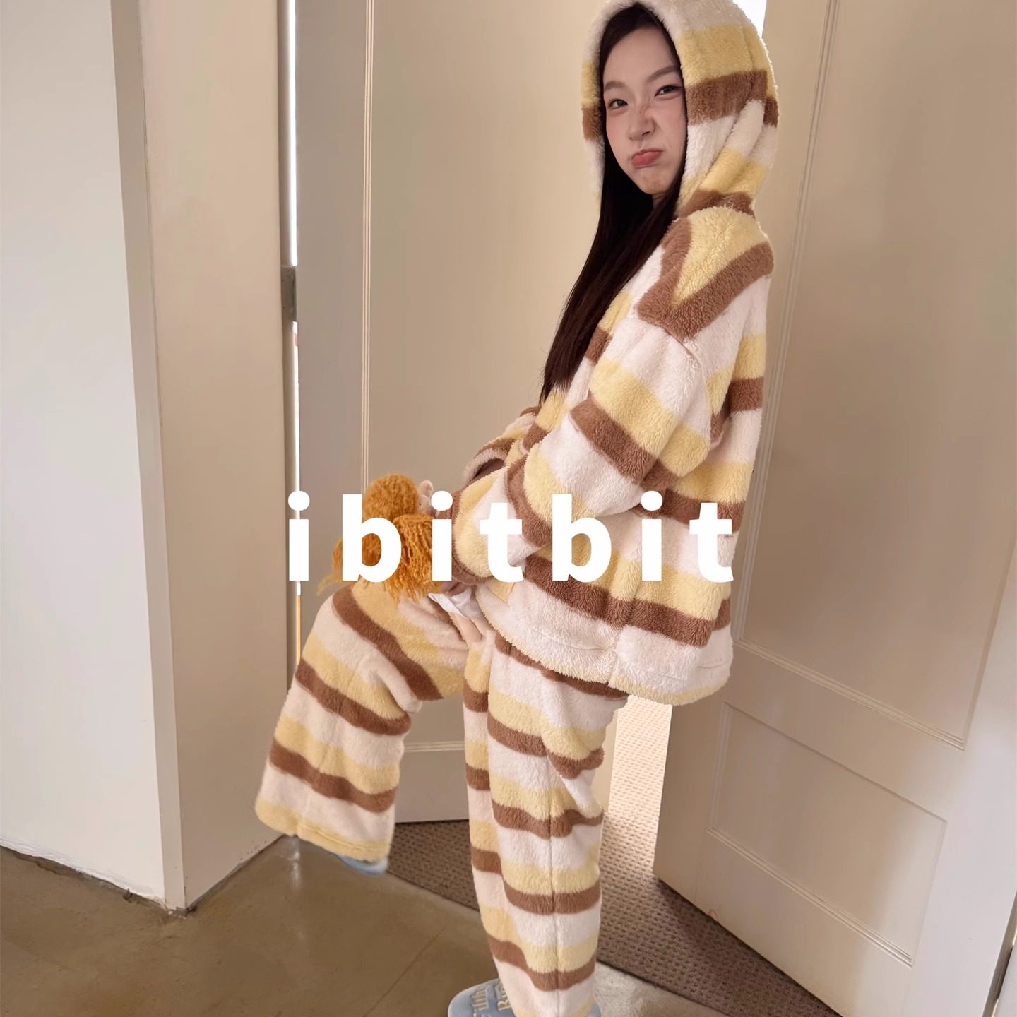 可外穿秋冬加厚珊瑚绒软糯亲肤连帽条纹保暖软绵绵家居服套装 睡衣