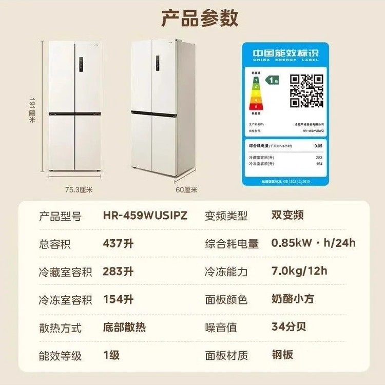 459WUSIPZ自动制冰超薄平嵌十字四门冰箱 华凌HR Midea 美
