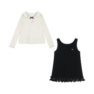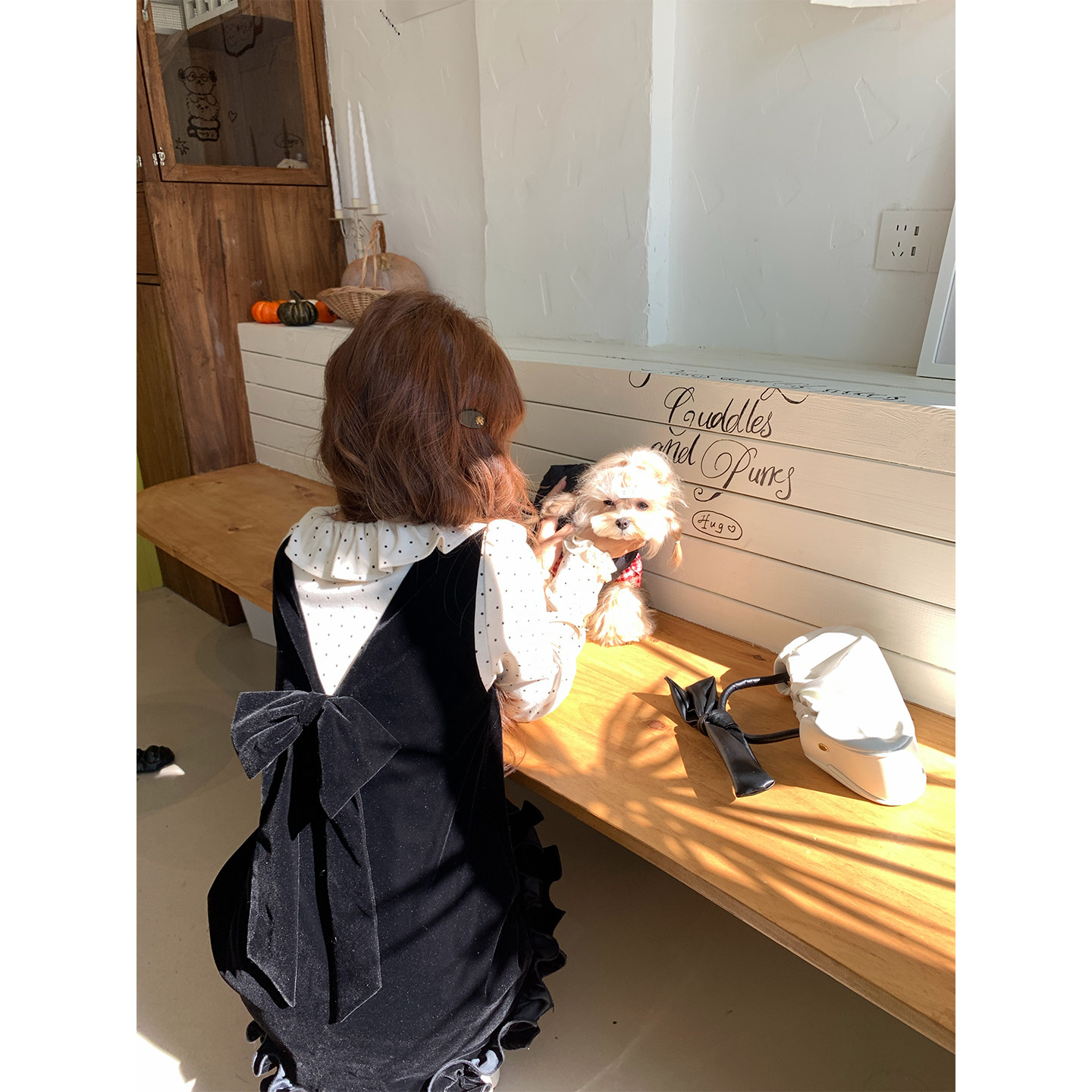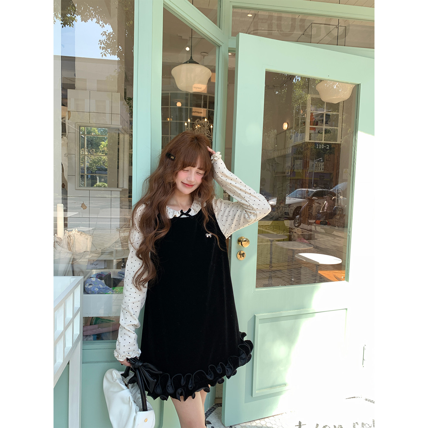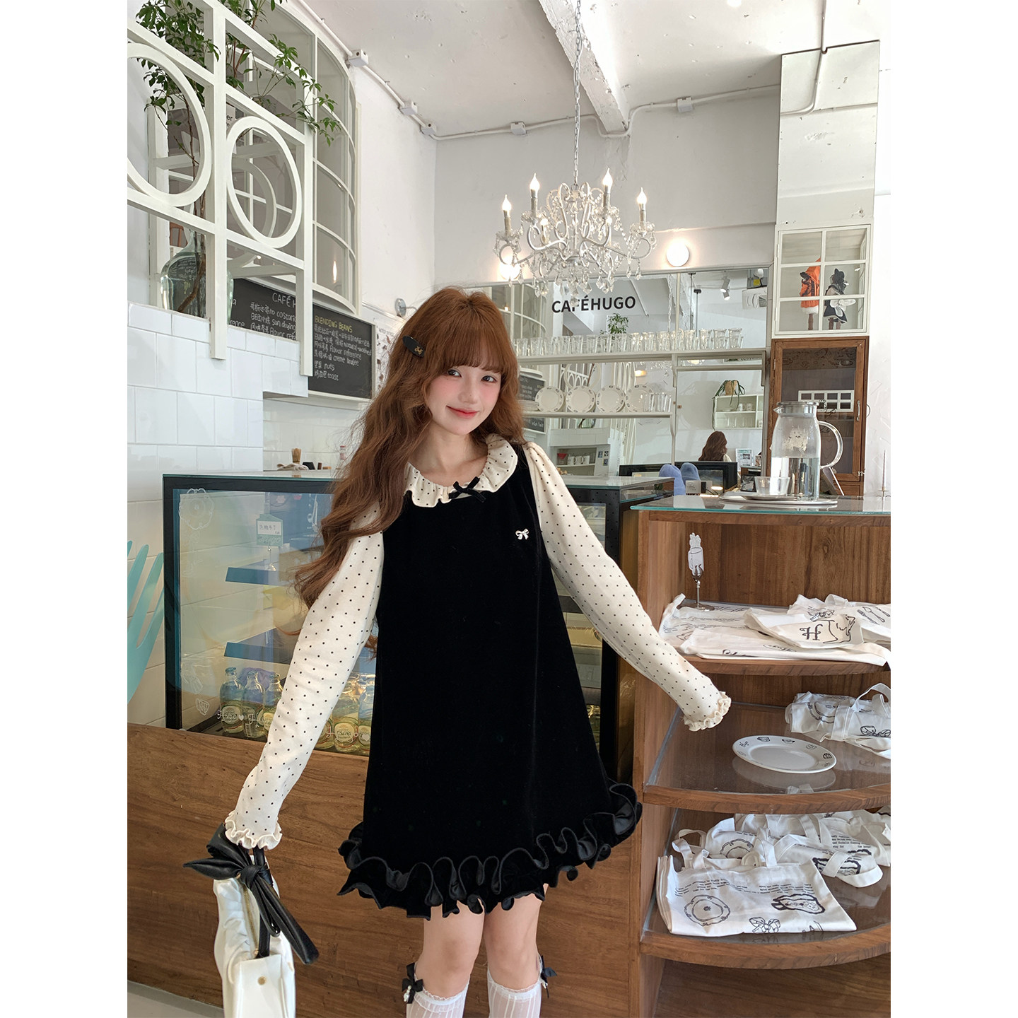 Palglg甜美风黑色丝绒背心连衣裙女冬季 木耳边直筒裙子 高级感法式