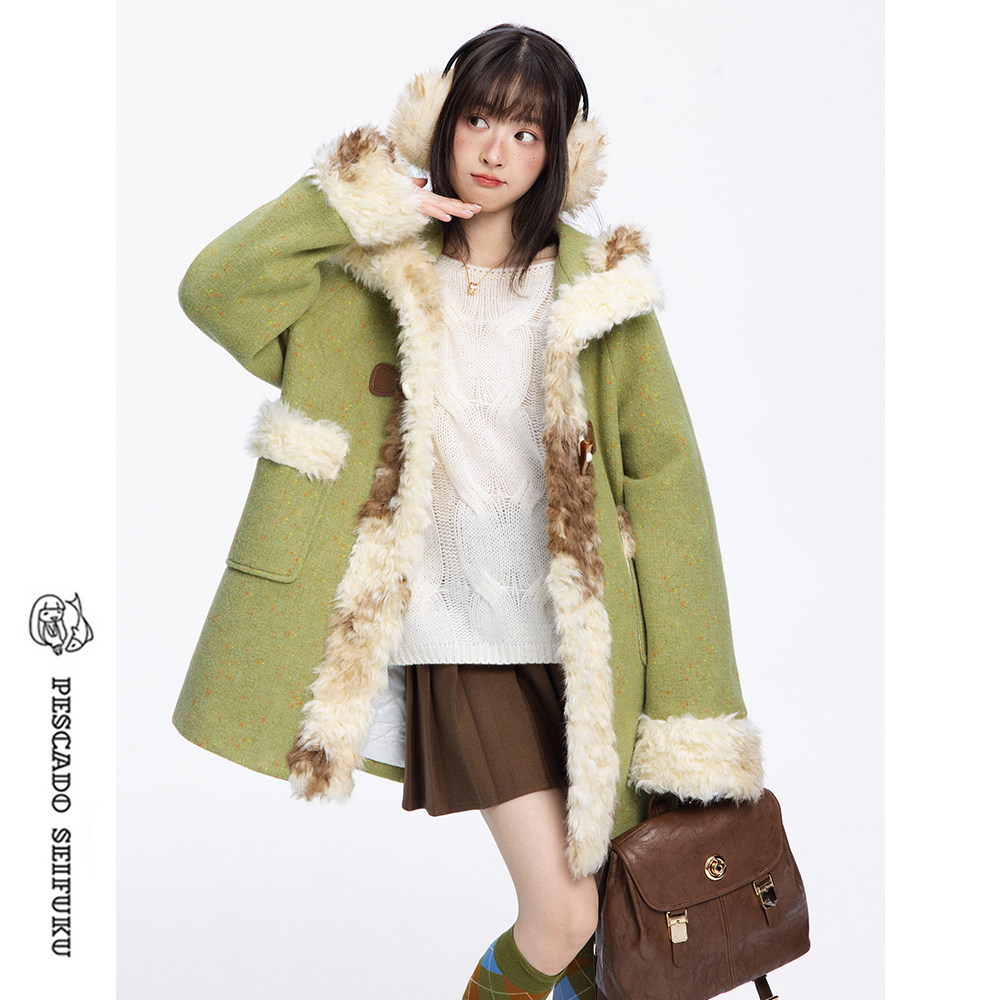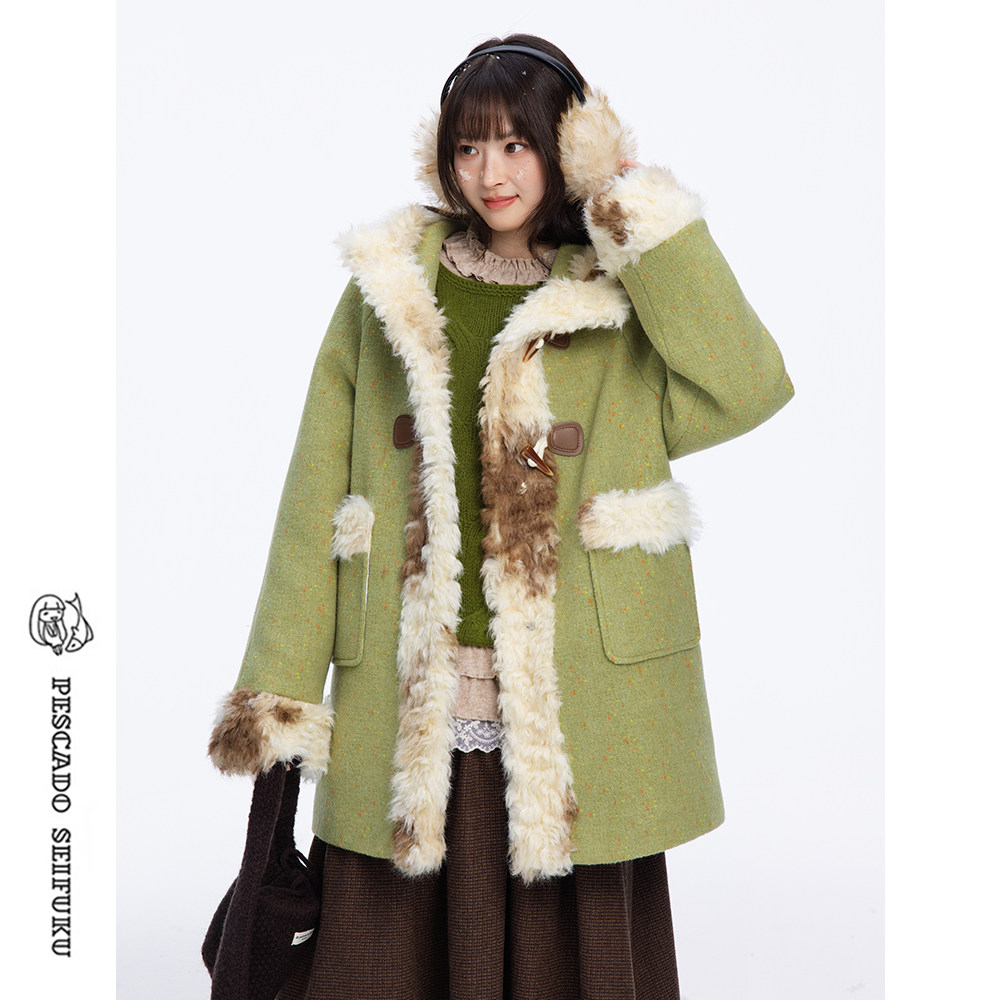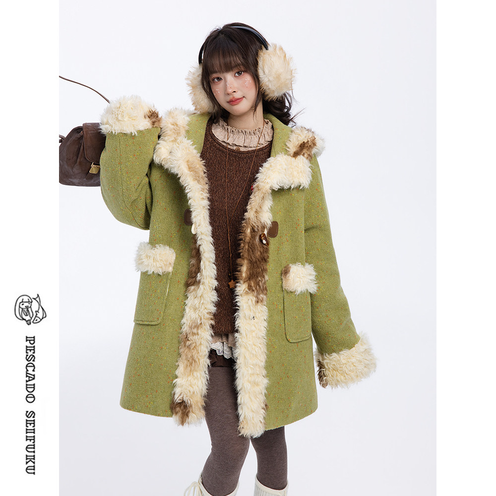 甜鱼少盐 牛角扣绿色大衣女冬加厚小个子羊毛毛呢外套 叶影青栖