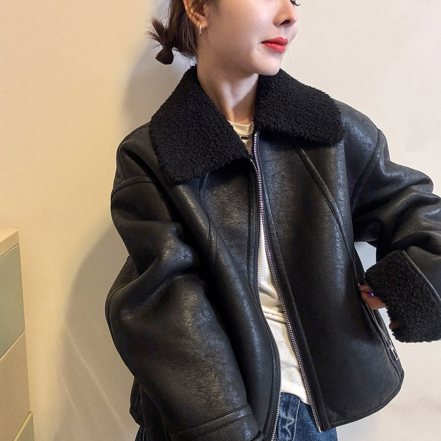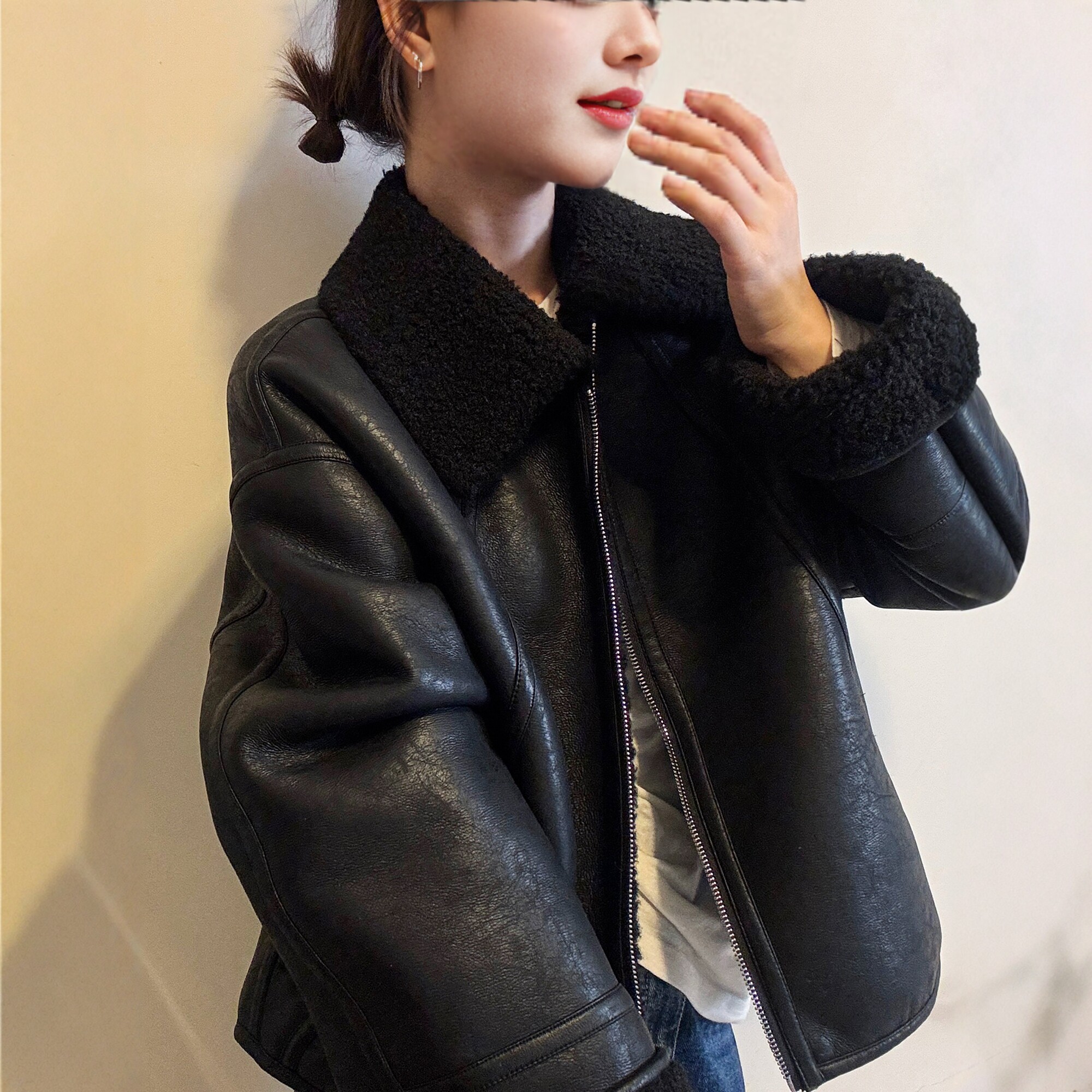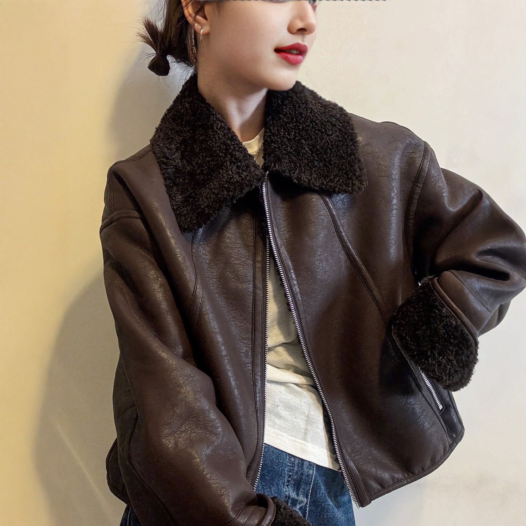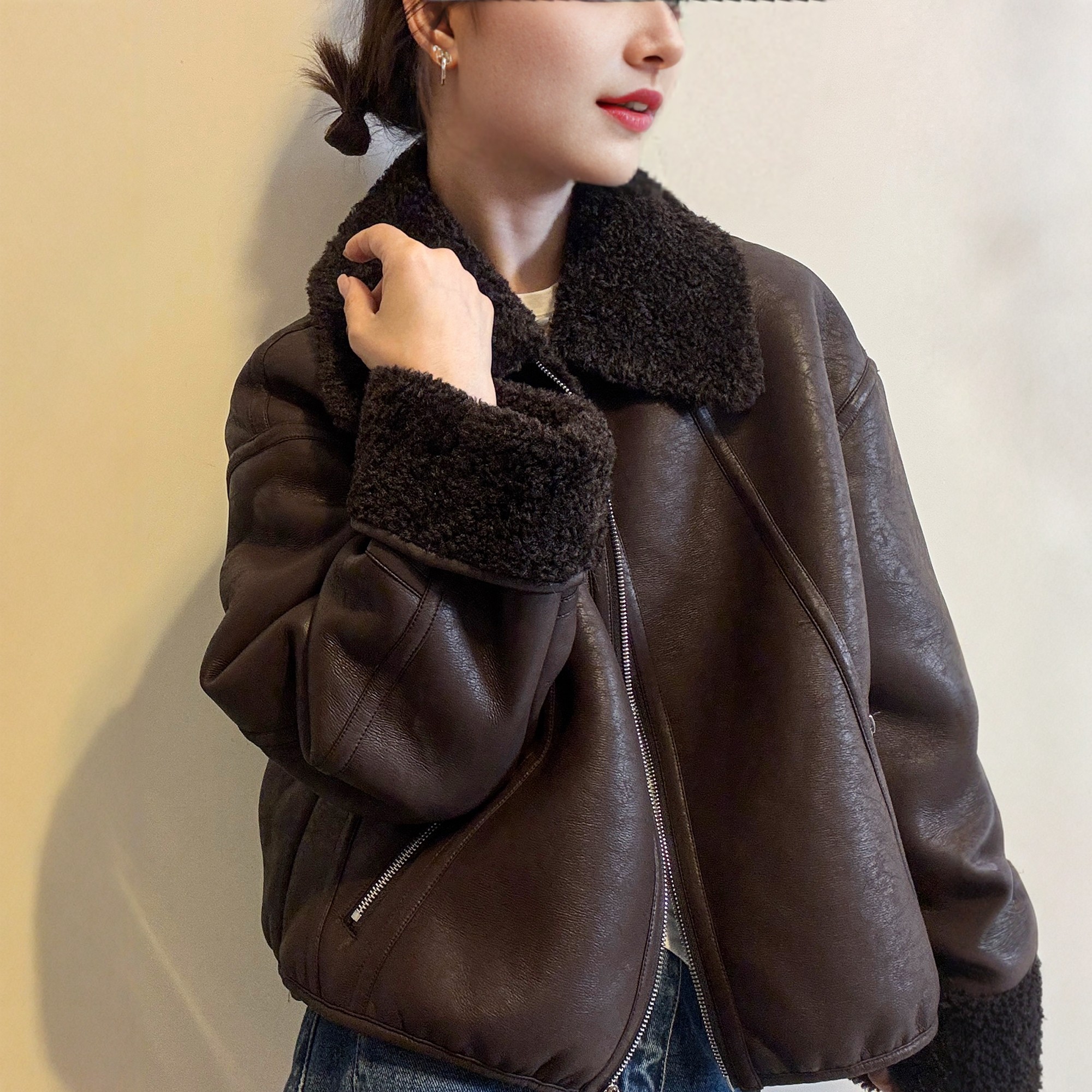 短款 欧货女装 上衣潮 新款 羊羔毛翻领皮毛一体外套女欧洲站2025冬装
