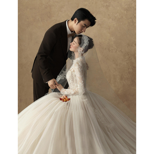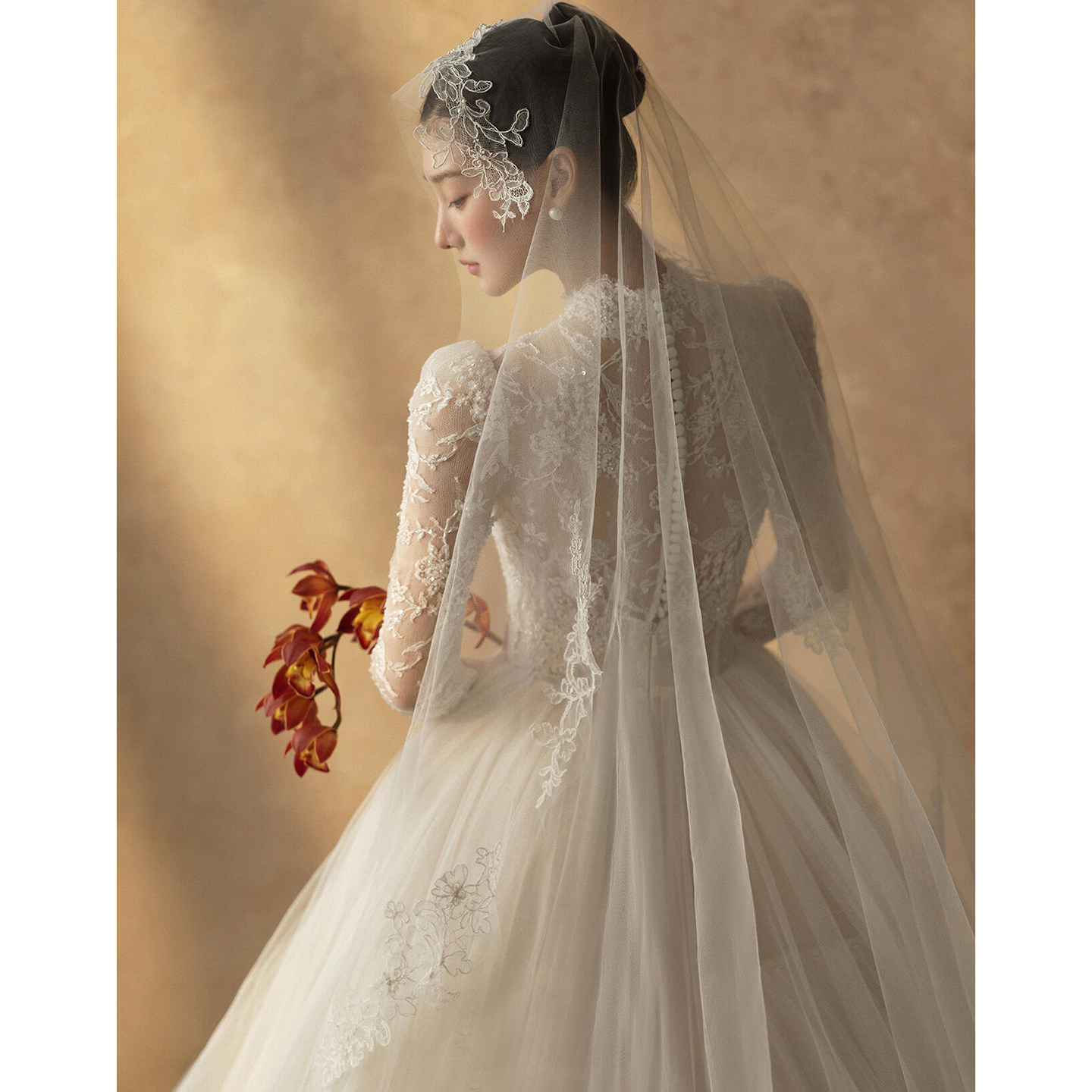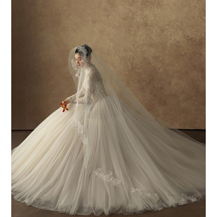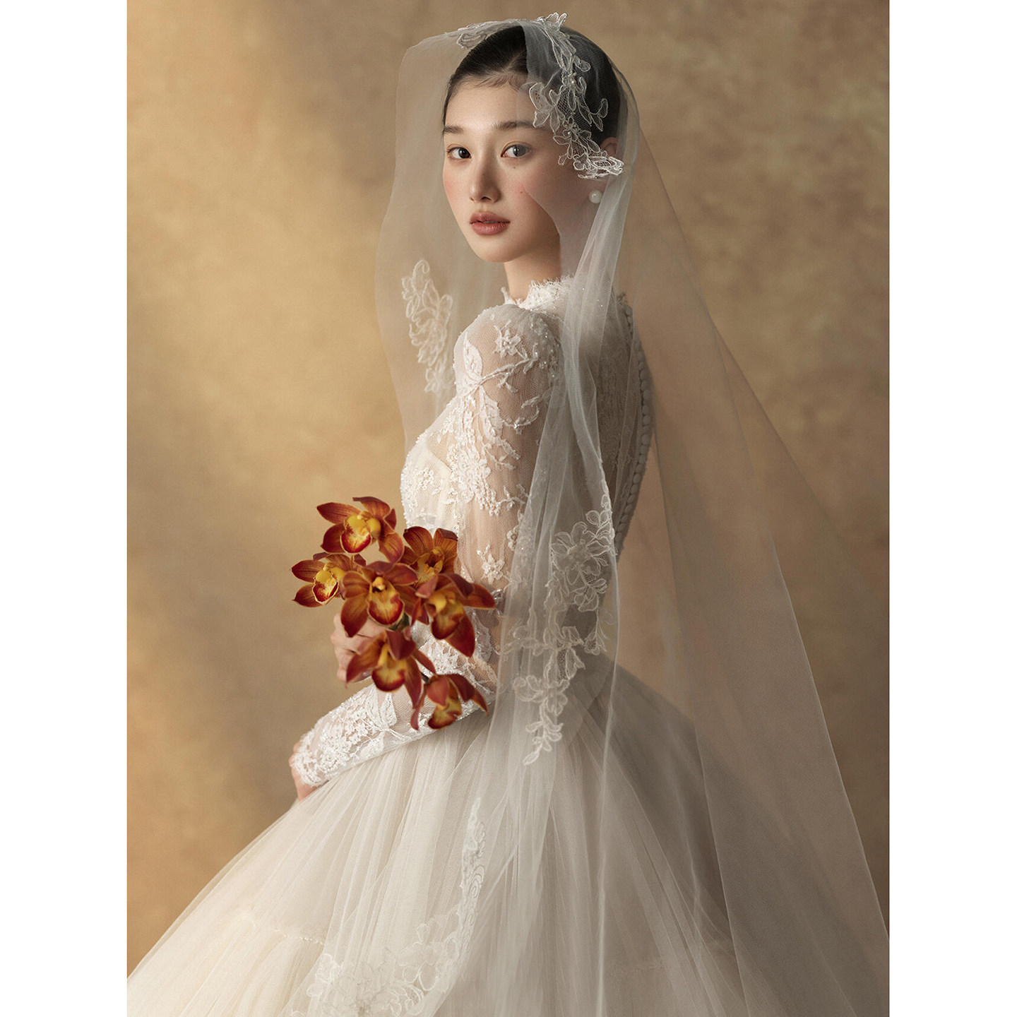 蕾丝抹胸小拖尾定制新娘婚纱轻纱套装 Veils设计师款 复古气质法式