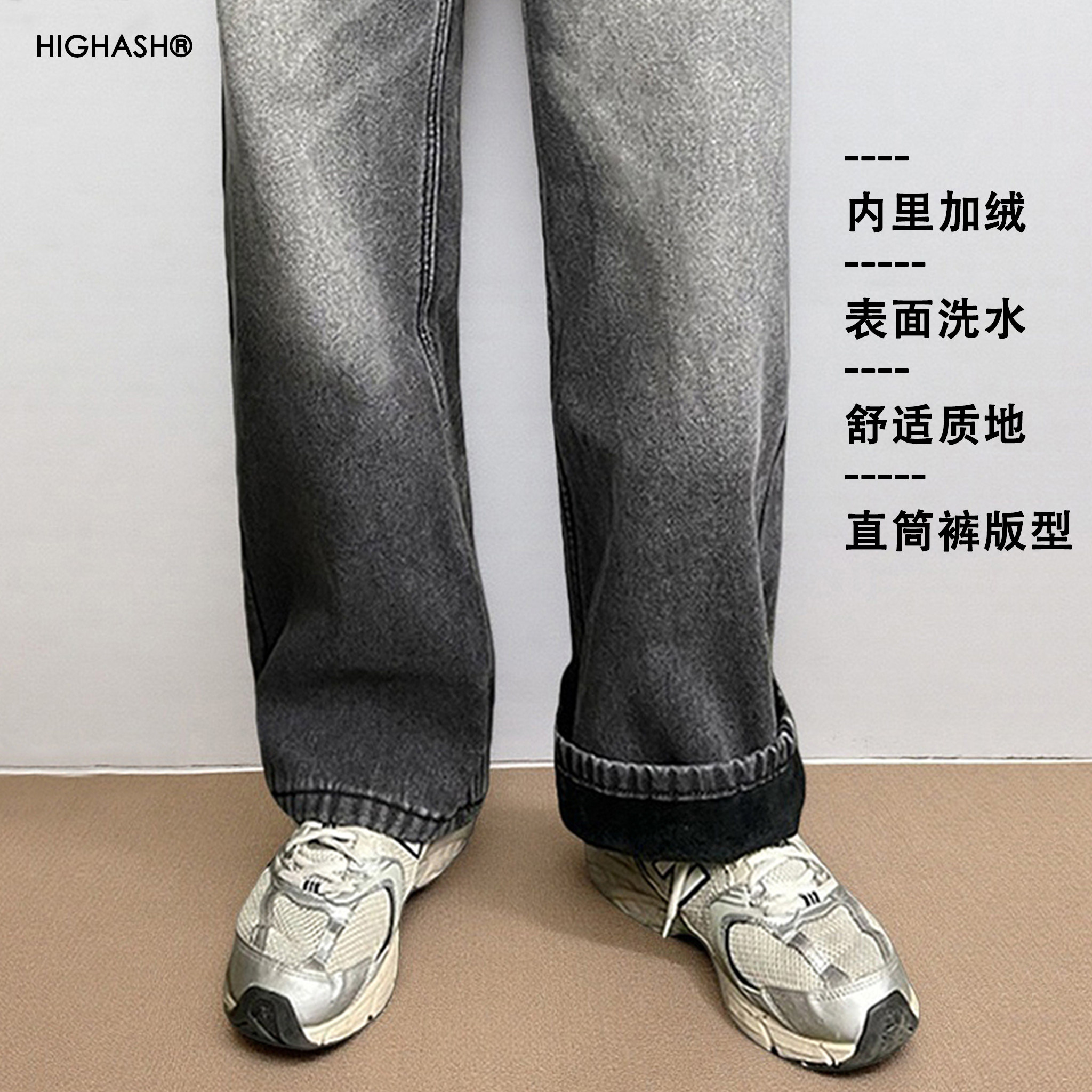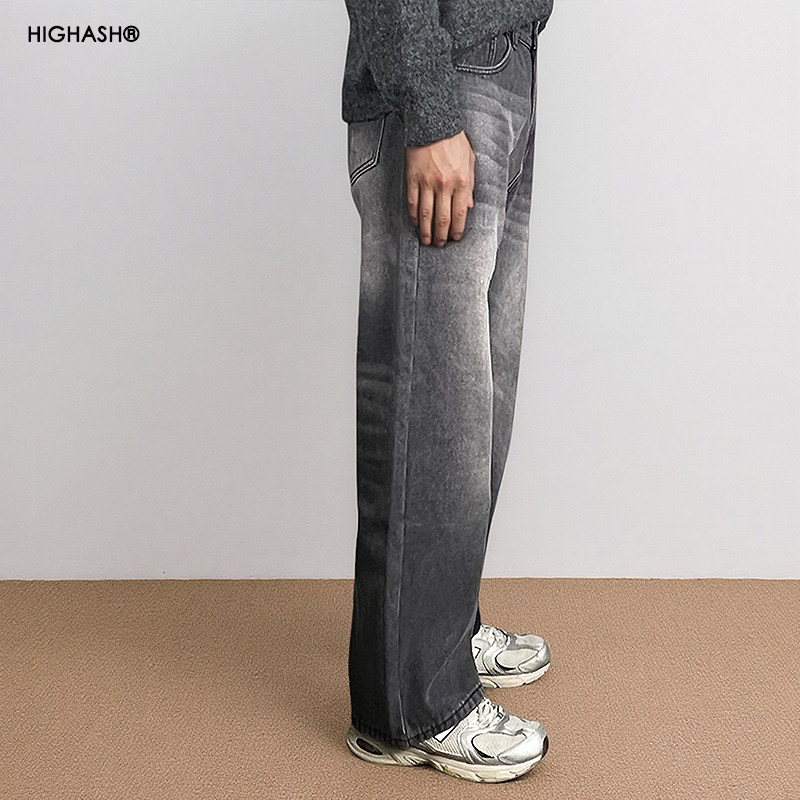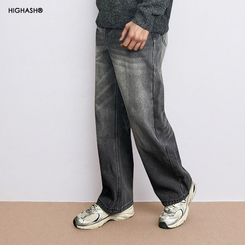 复古直筒牛仔裤 HIGHASH加绒保暖洗水休闲慵懒风灰色男长裤 美式