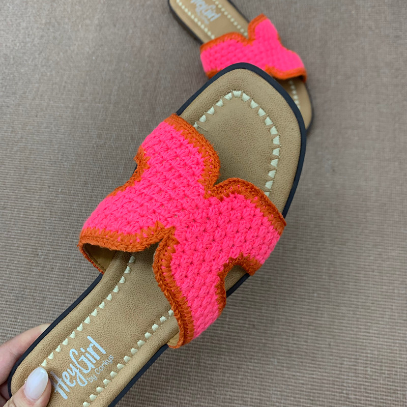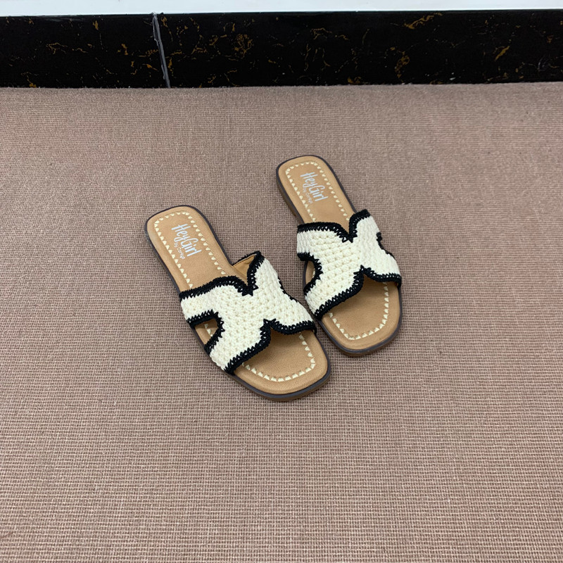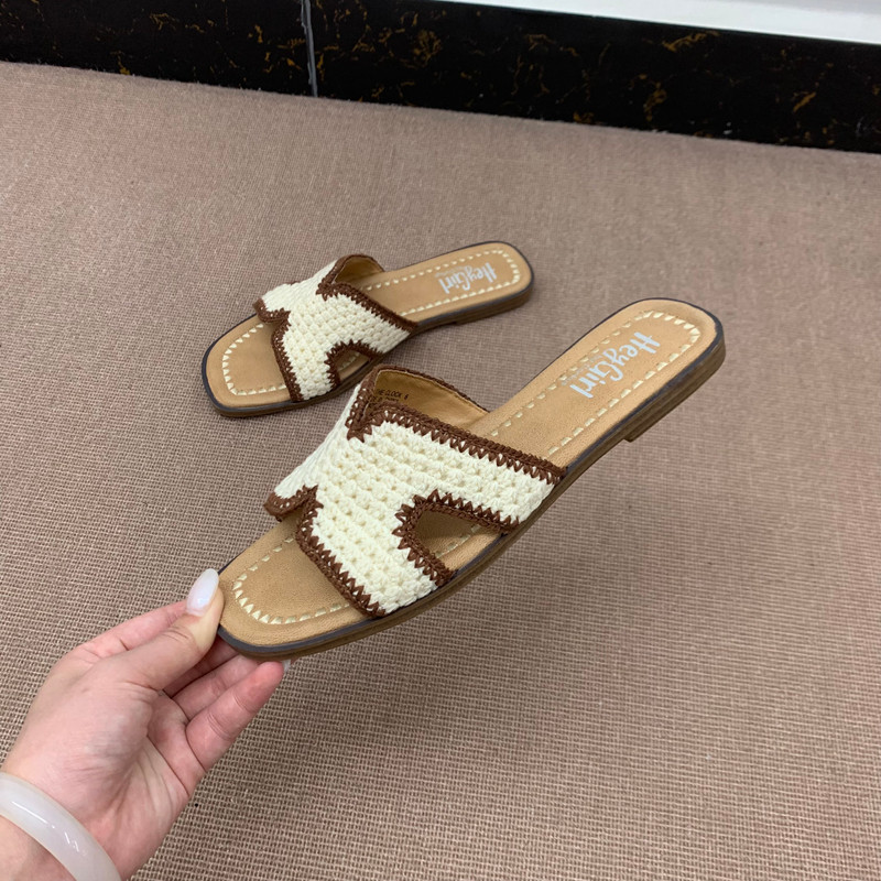 外穿平底百搭轻便防滑凉拖鞋 外贸单出口简约风编织一字拖大码 女鞋