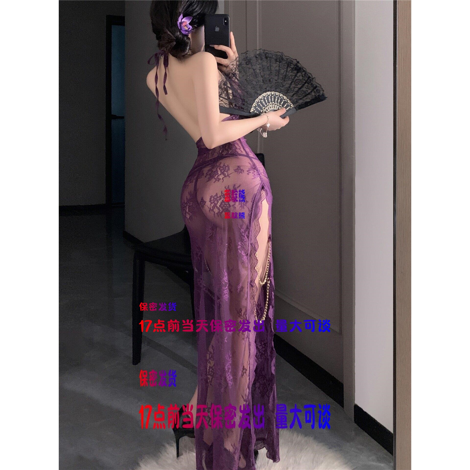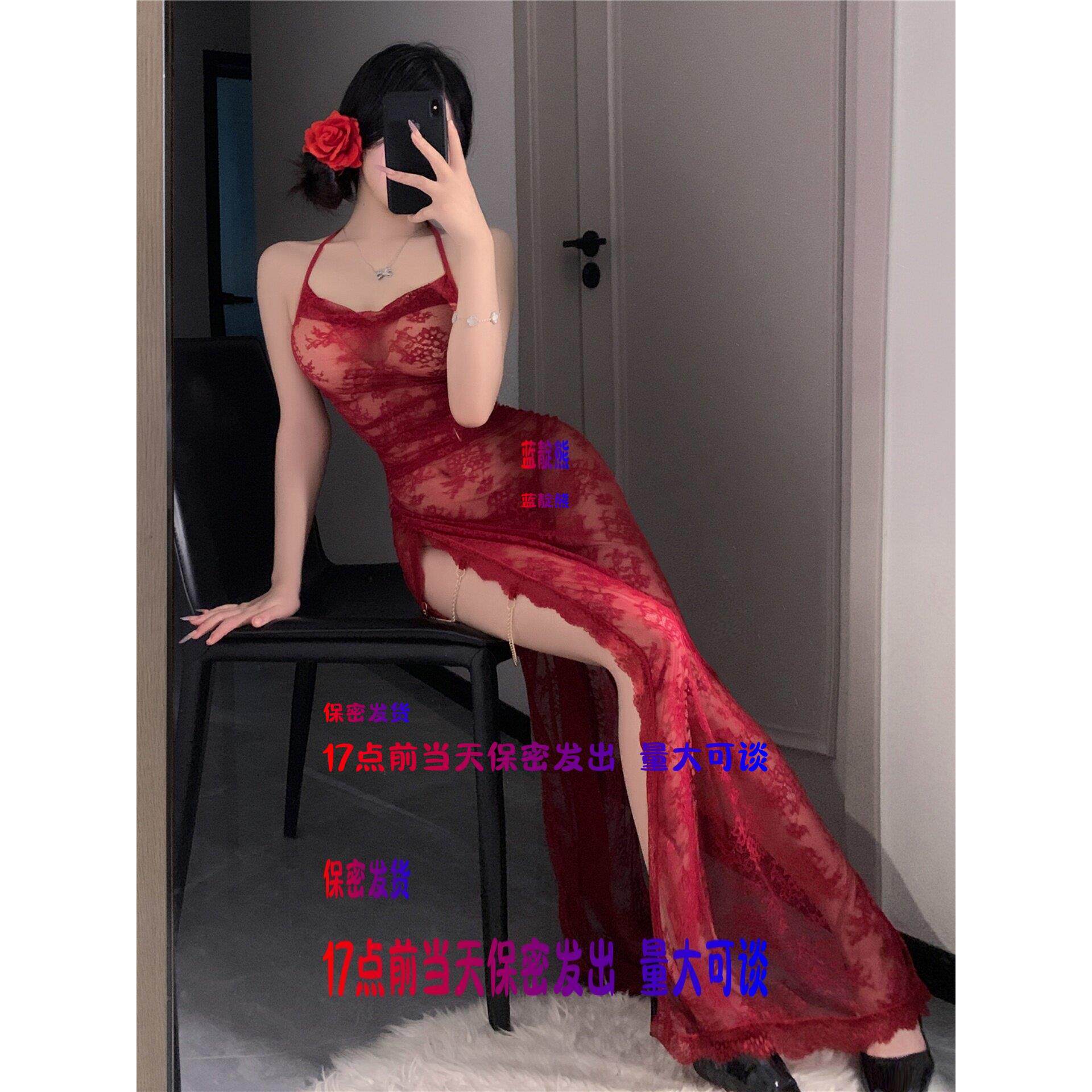 朦胧感性感挂脖睡裙长款 蕾丝链条高级感睡衣制服高开叉纯欲镂空