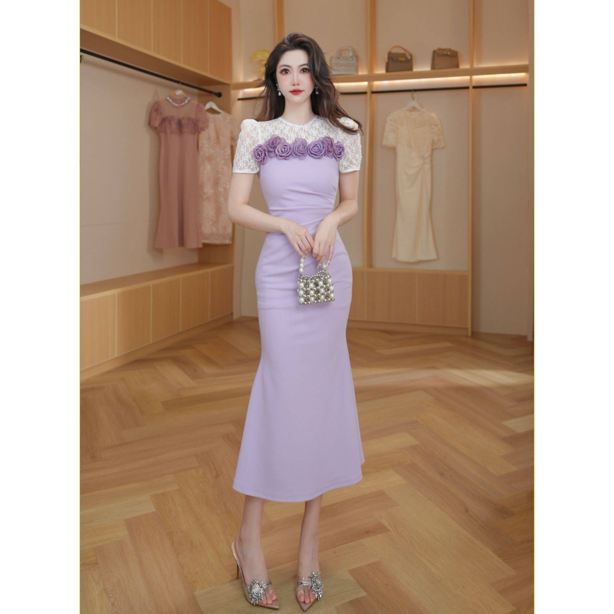 气质连衣裙 收腰花朵拼接修身 15642紫色短裙中长蕾丝裙夏季 新款