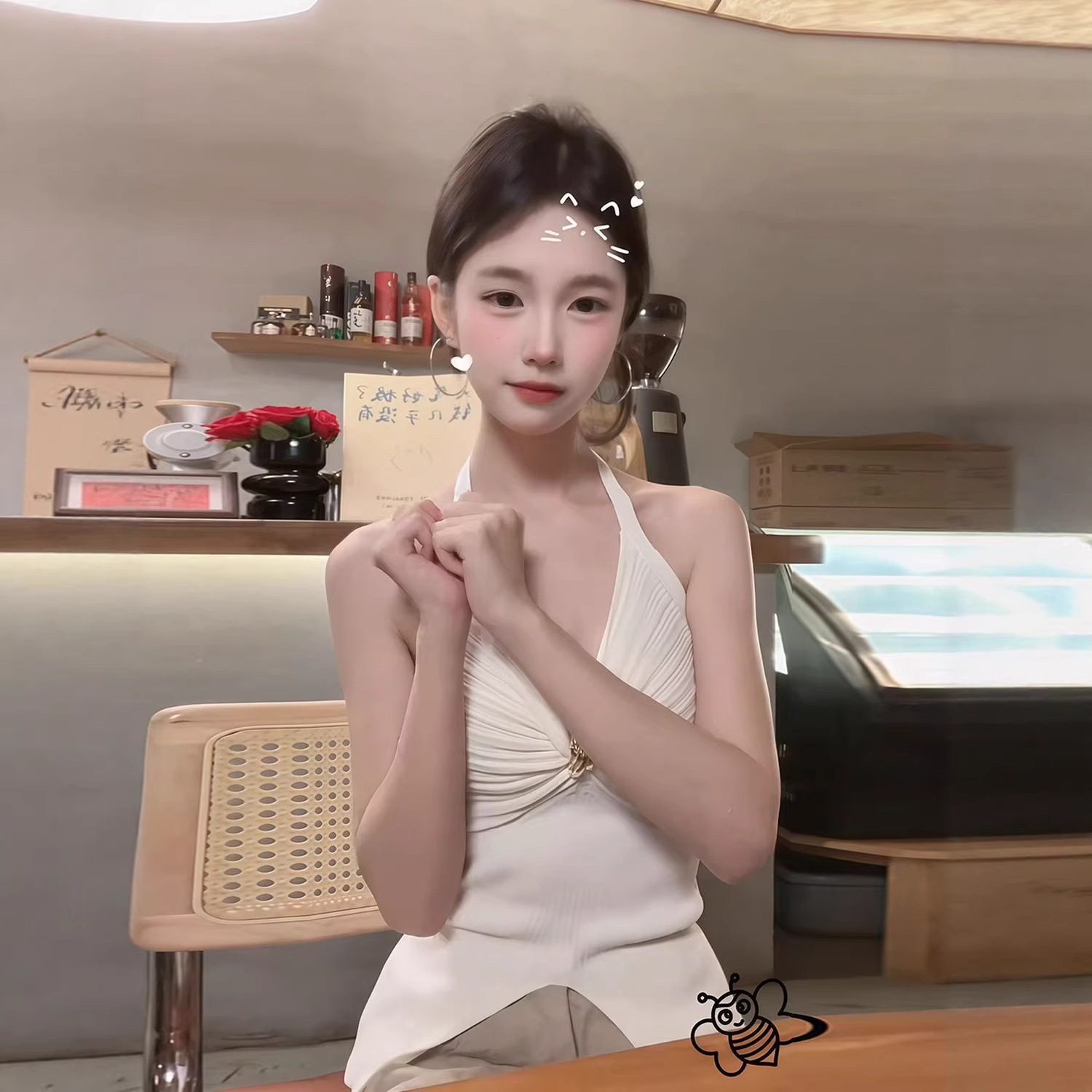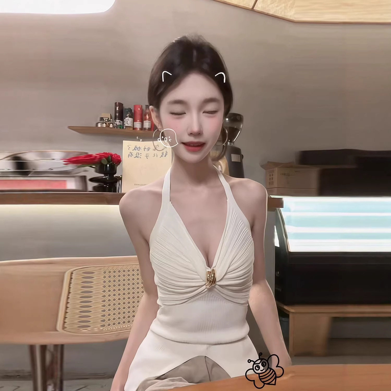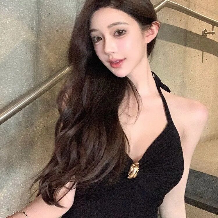 美式 捏褶v领上衣女设计感系带挂脖背心辣妹吊带上衣 辣妹性感修身