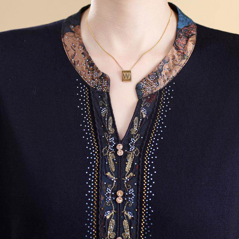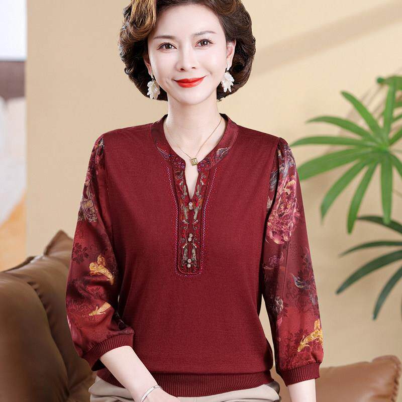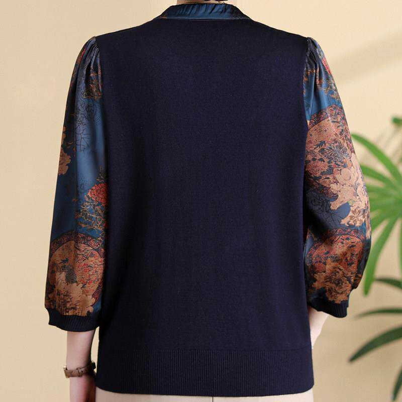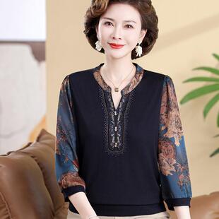 针织拼接小衫 老年妈妈春秋中袖 纱袖 桑蚕丝上衣中老年女装 T恤 大码