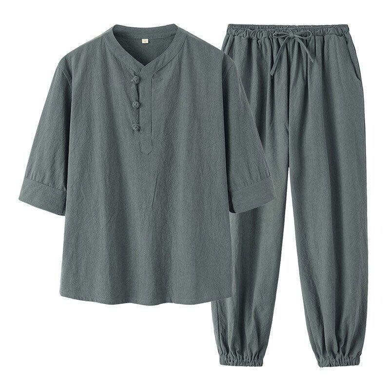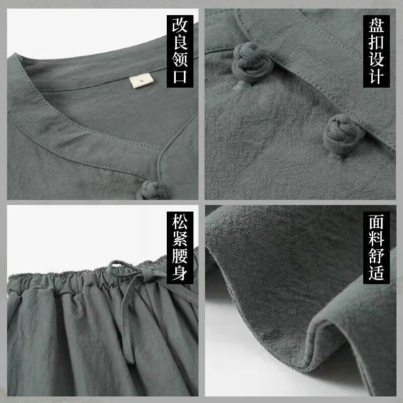 男装 休闲长裤 中国风夏季 薄款 棉麻两件套 亚麻套装 七分袖 男宽松大码