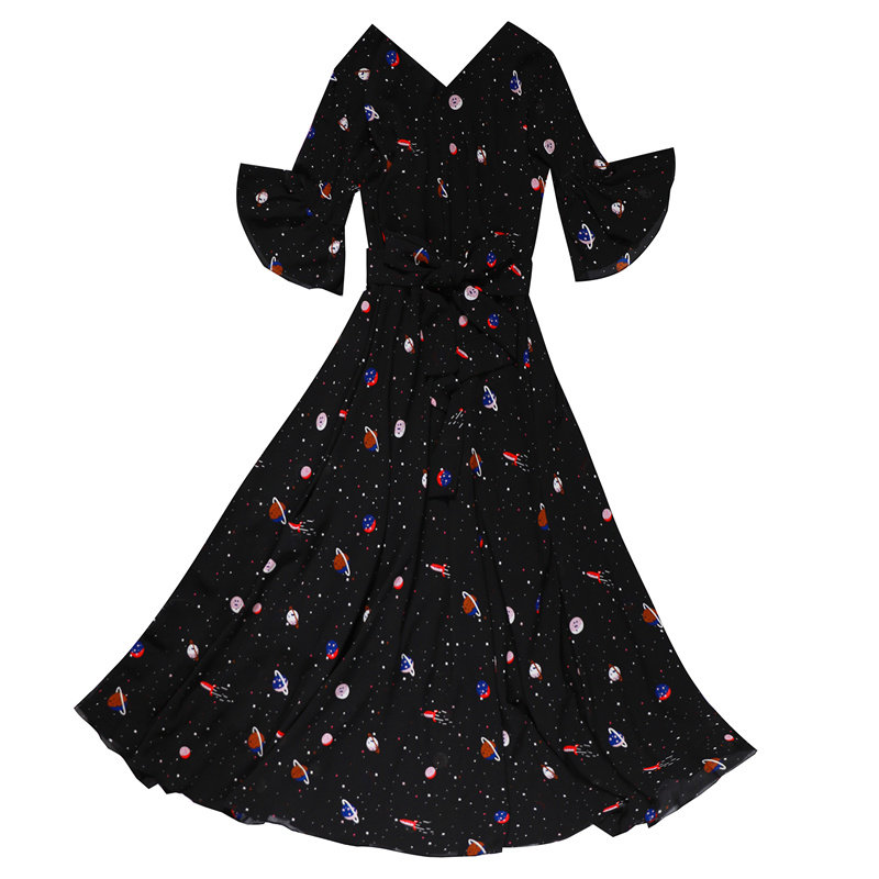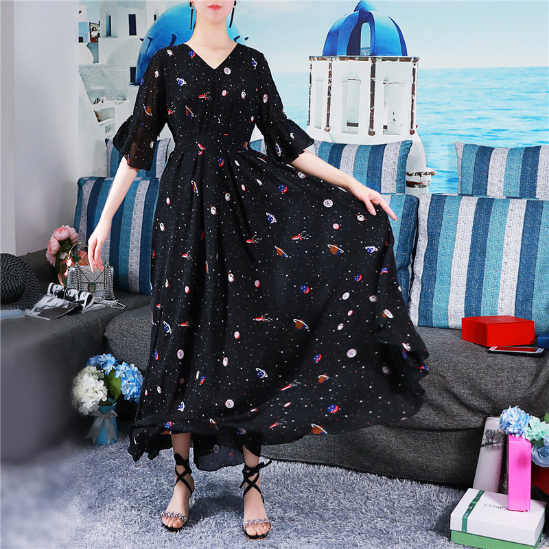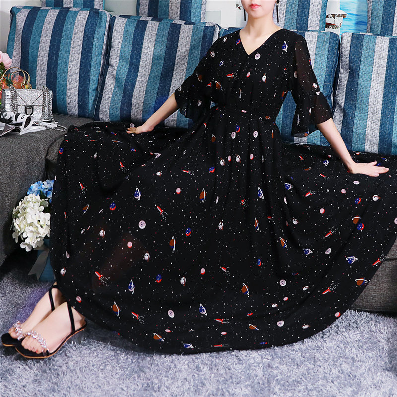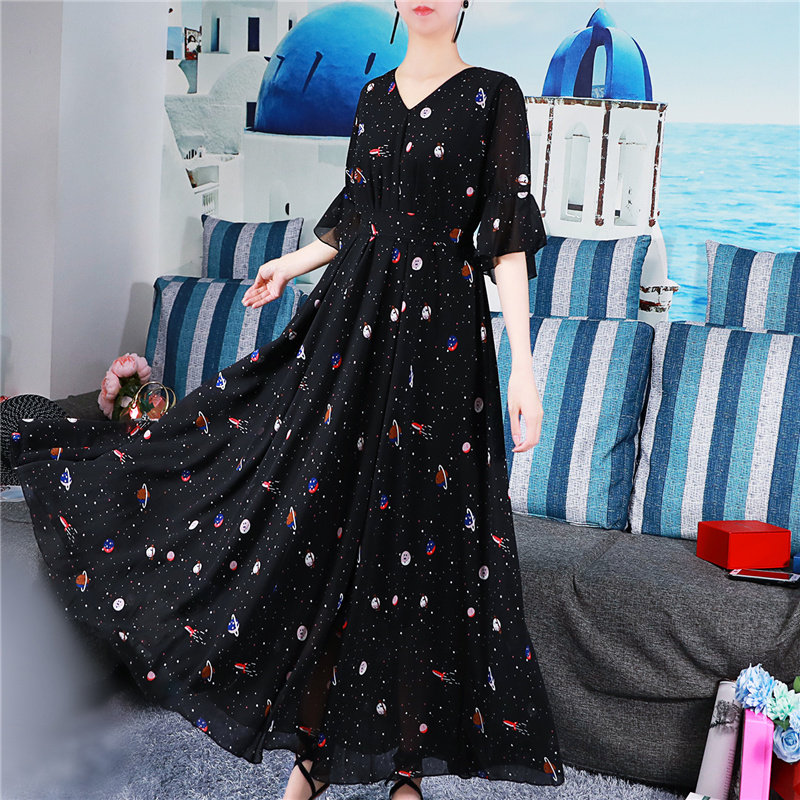 2021新款 宽松显瘦高腰小碎花春夏过膝长裙女复古裙 雪纺连衣裙大码
