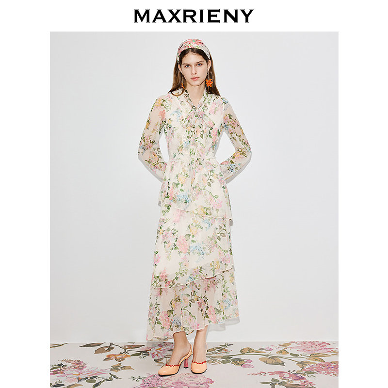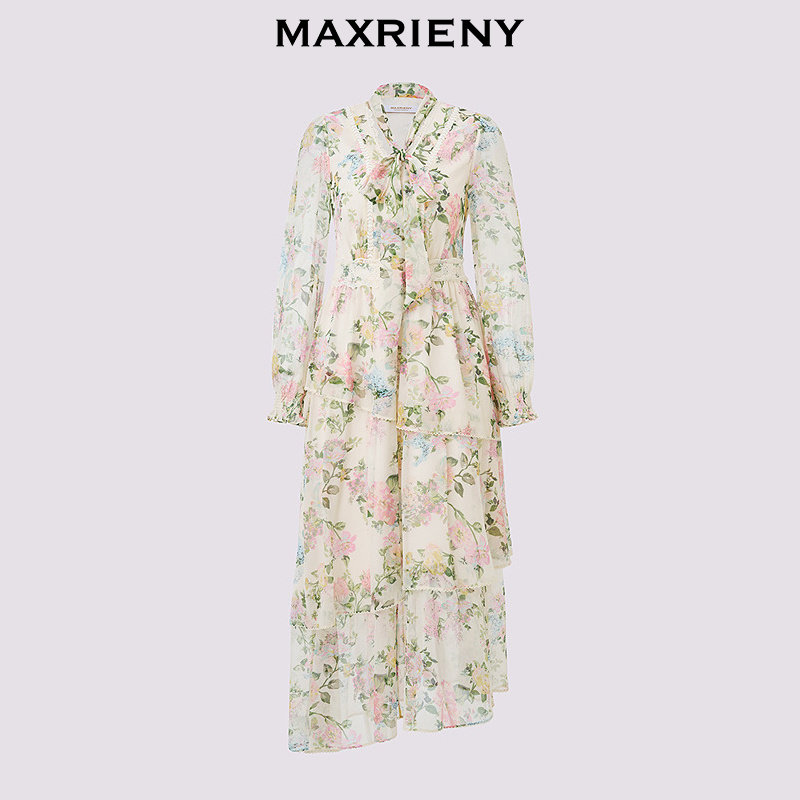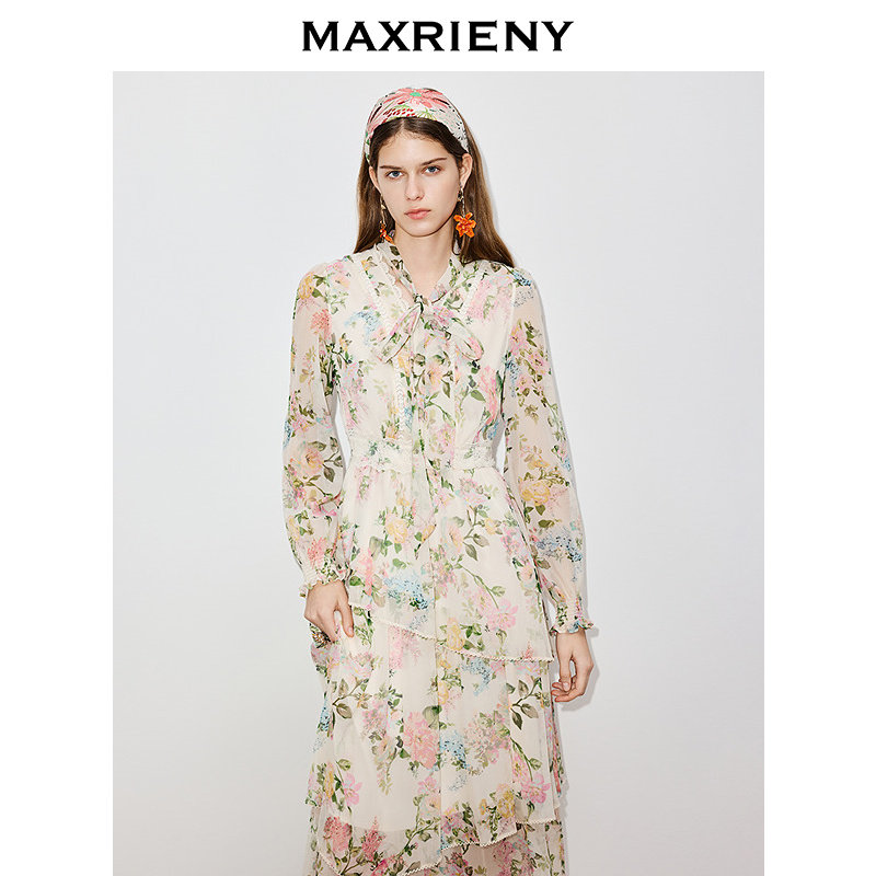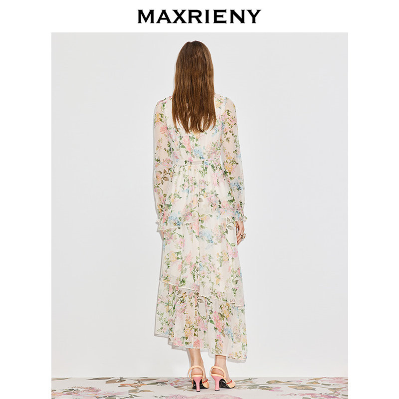新款 MAXRIENY桑蚕丝连衣裙2026春季 V领收腰印花裙子 商场同款