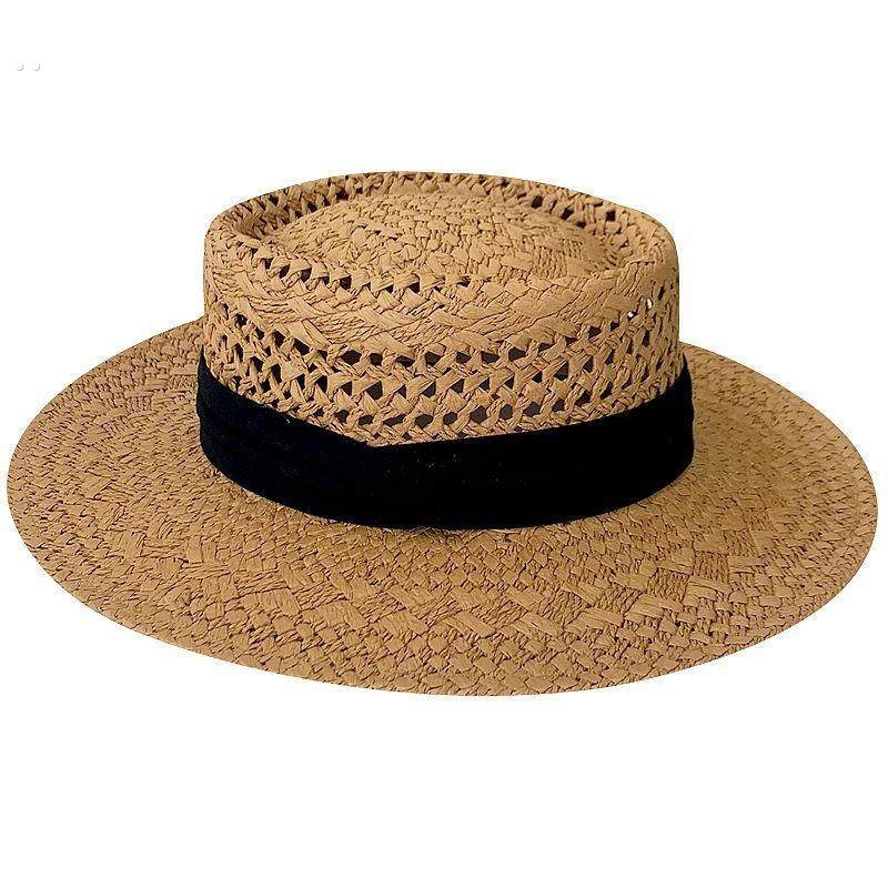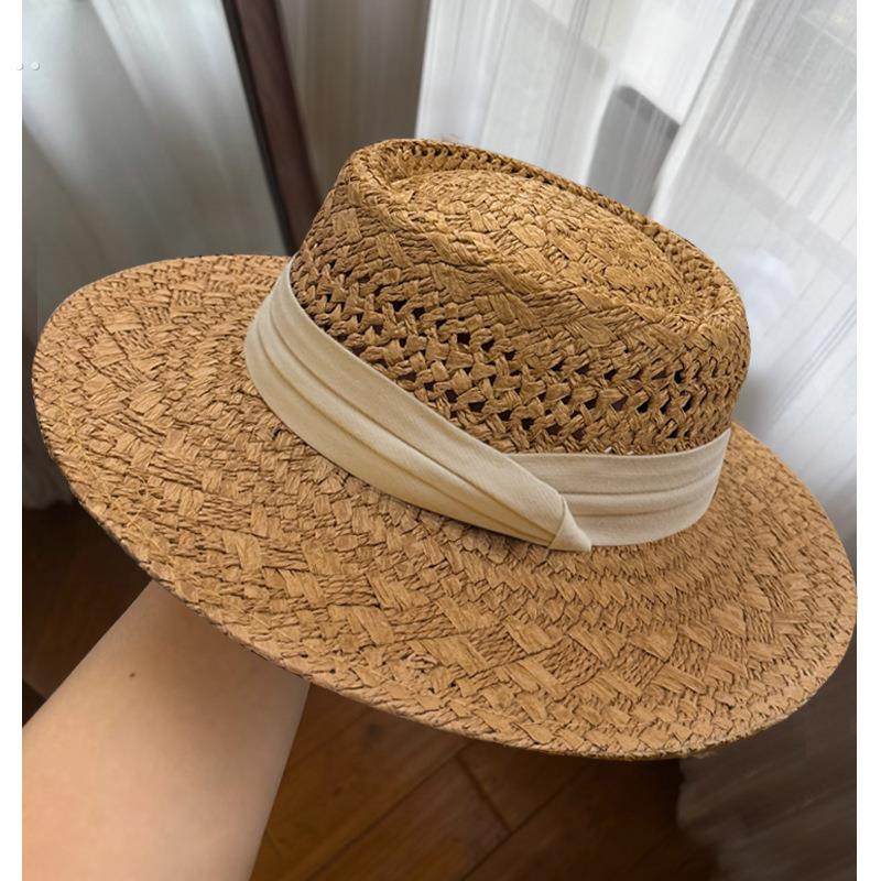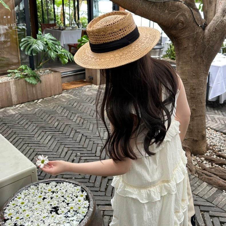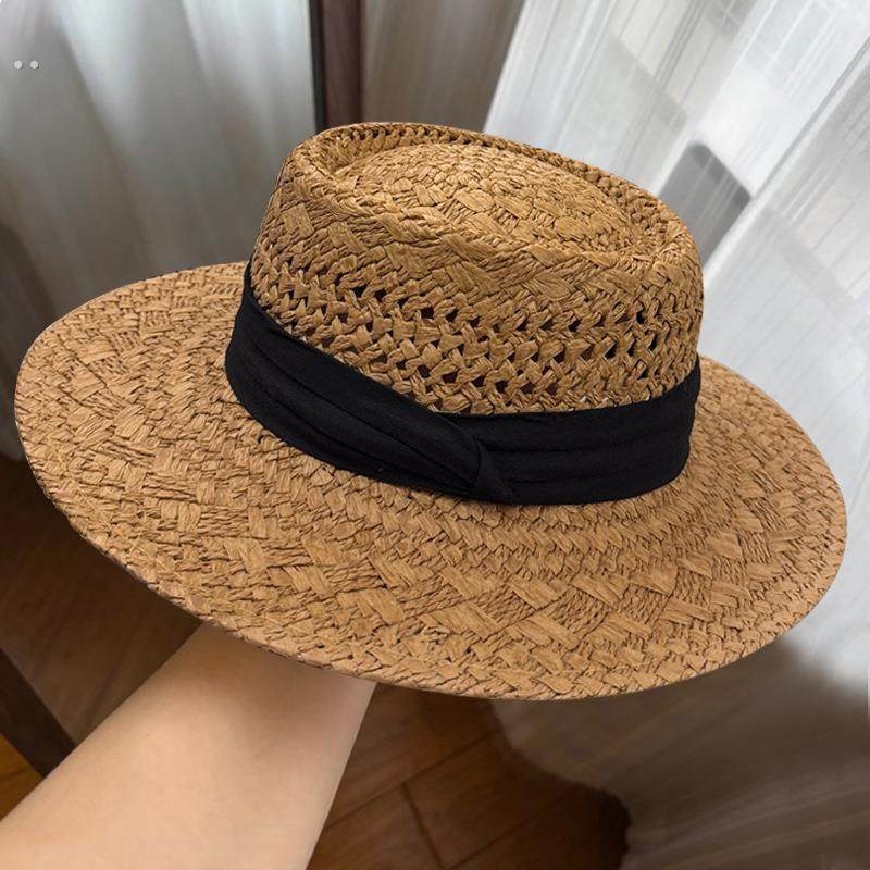 硬纸草镂空棉麻织带草编帽女夏季 出游旅行防紫外线平顶草帽遮阳帽