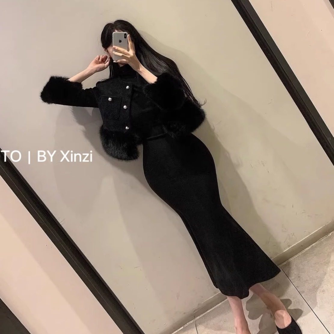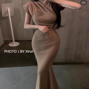 针织连衣裙女收腰修身 优雅高领短袖 打底包臀长裙 法式 辛子韩国代购