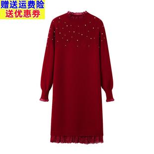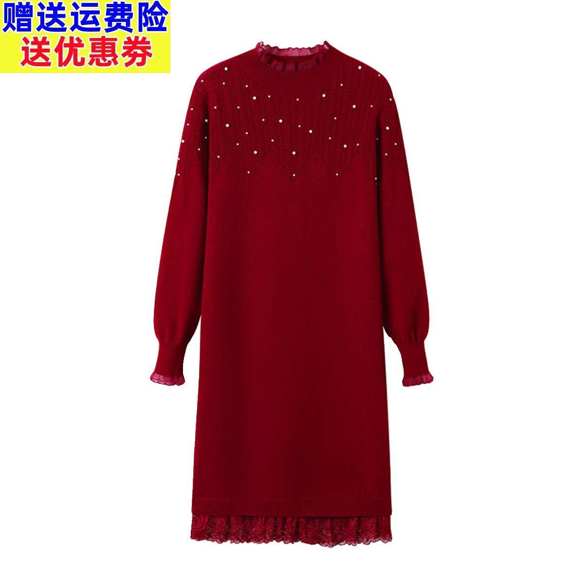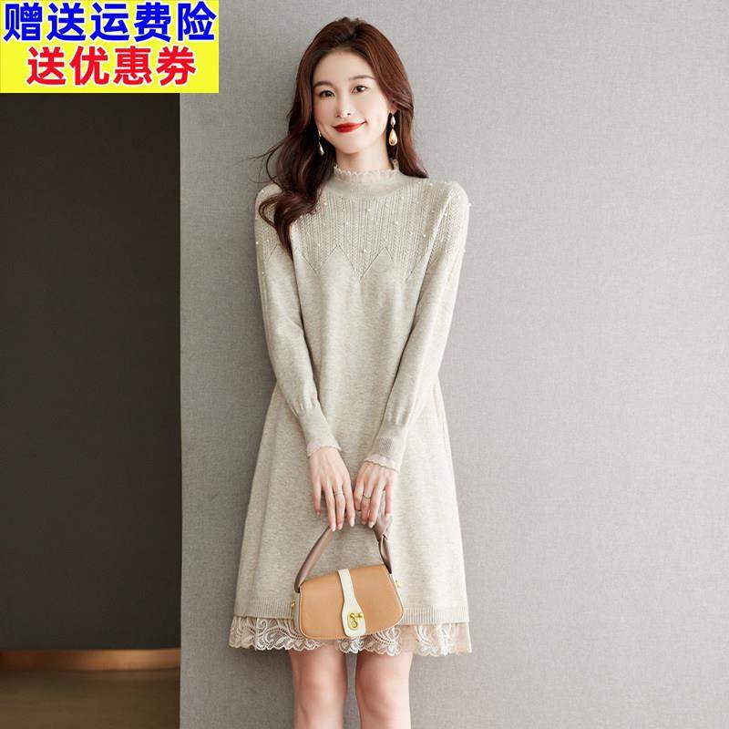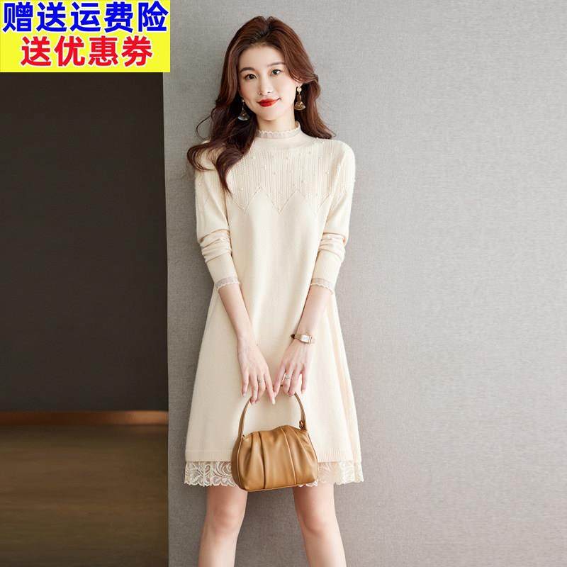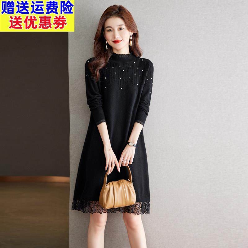 打底衫 蕾丝针织连衣裙毛衣女秋冬中长款 羊毛衫 女装 钉珠裙宽松大码