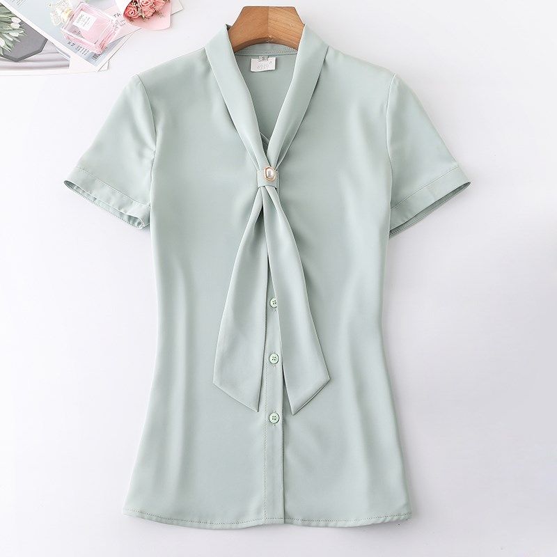 薄款 夏季 气质工作服高级感职业套裙套头雪纺上衣 女短袖 飘带领衬衫