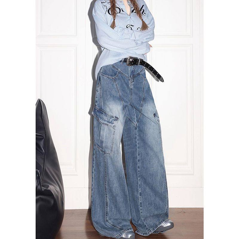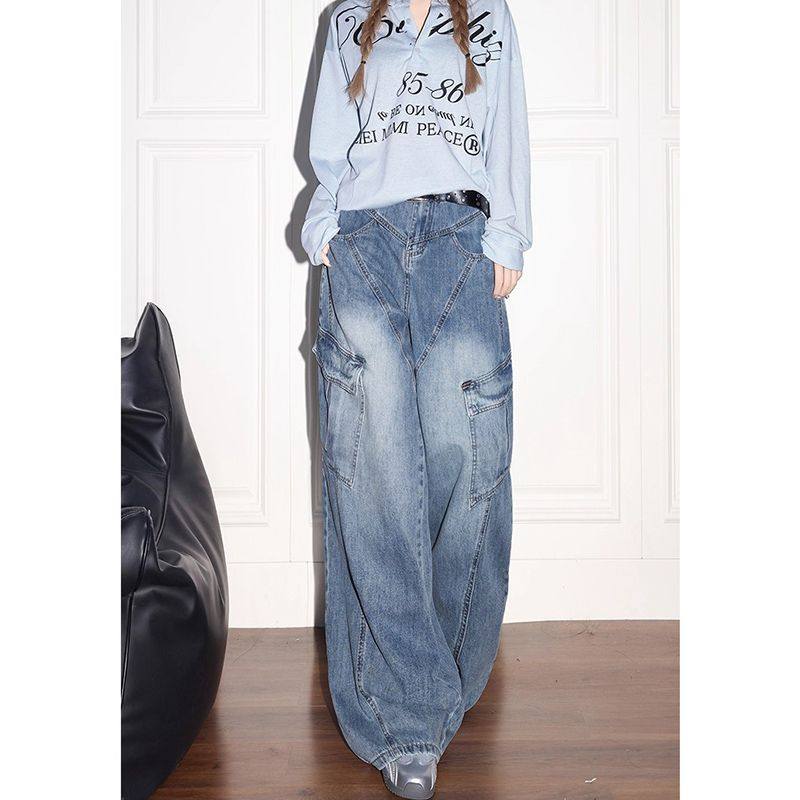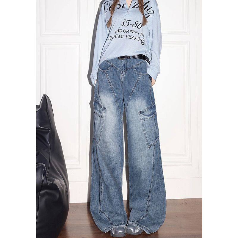 拖地牛仔裤 韩版 宽松设计感个性 女春秋新款 潮 气质高腰阔腿牛仔裤